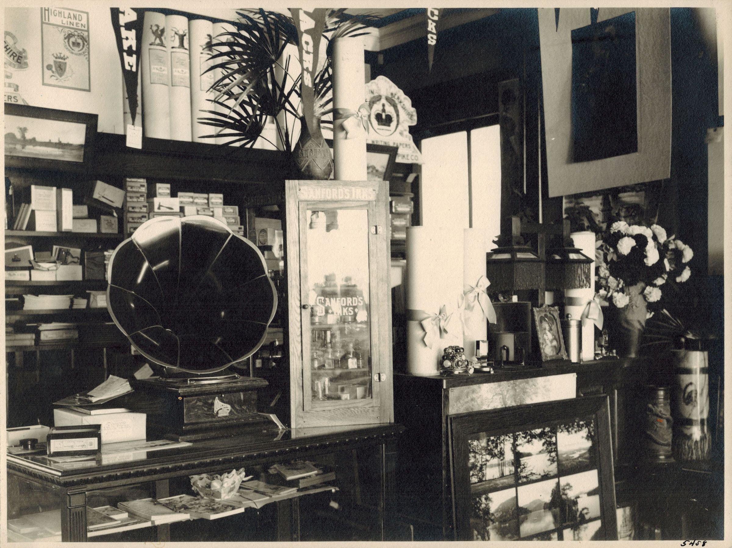 Black-and-White photograph of the interior of William Kollecker's Kodak and Gift Shop in the larger center section of the Coulter Block. The shelves are filled with photographic prints, cameras, supplies, frames, knickknacks, and other items. A phonograph and a display case of Sanford's Inks sit on the counter.