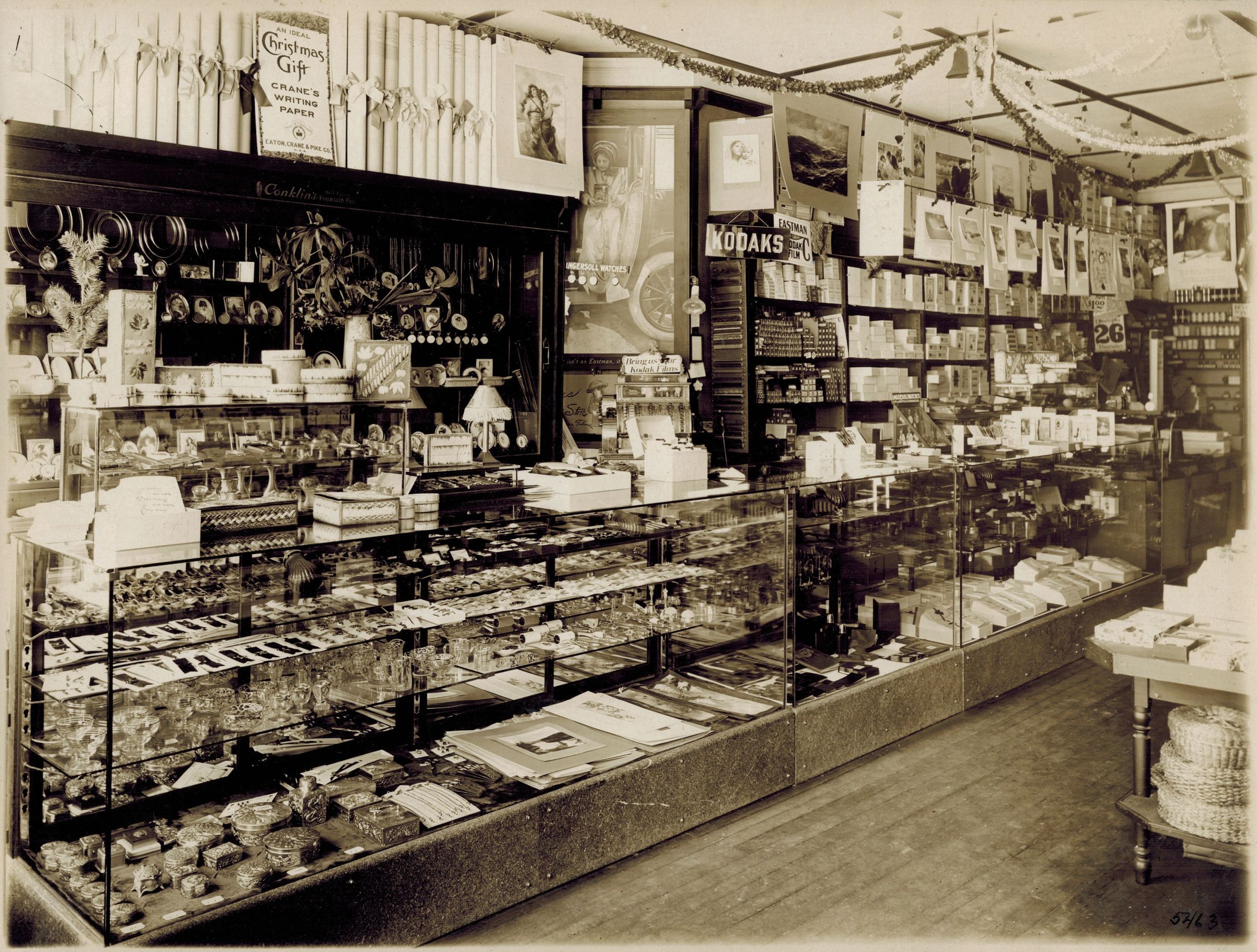 Black-and-White photograph of the interior of William Kollecker's Kodak and Gift Shop in the larger center section of the Coulter Block. Counters line the shop. The shelves are filled with photographic prints, supplies, frames, postcards, knickknacks, and other items. Paper garlands are hanging from the ceiling.