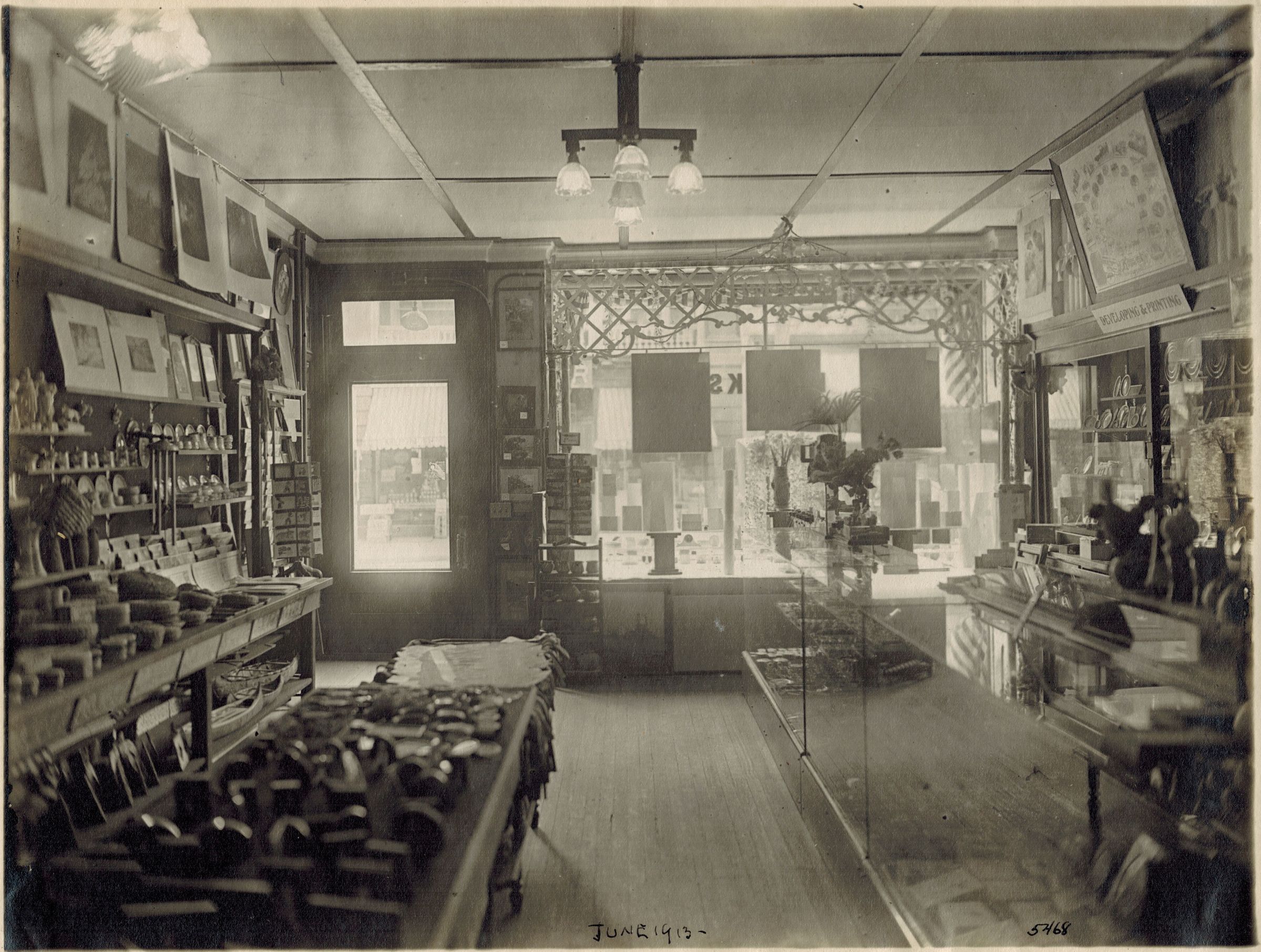 Black-and-White photograph of the interior of William Kollecker's Kodak and Gift Shop in the larger center section of the Coulter Block. The photograph was taken looking toward the window on Main Street. Counters line the room, and the store is filled with photographic prints, supplies, frames, postcards, baskets, souvenirs, and other items.