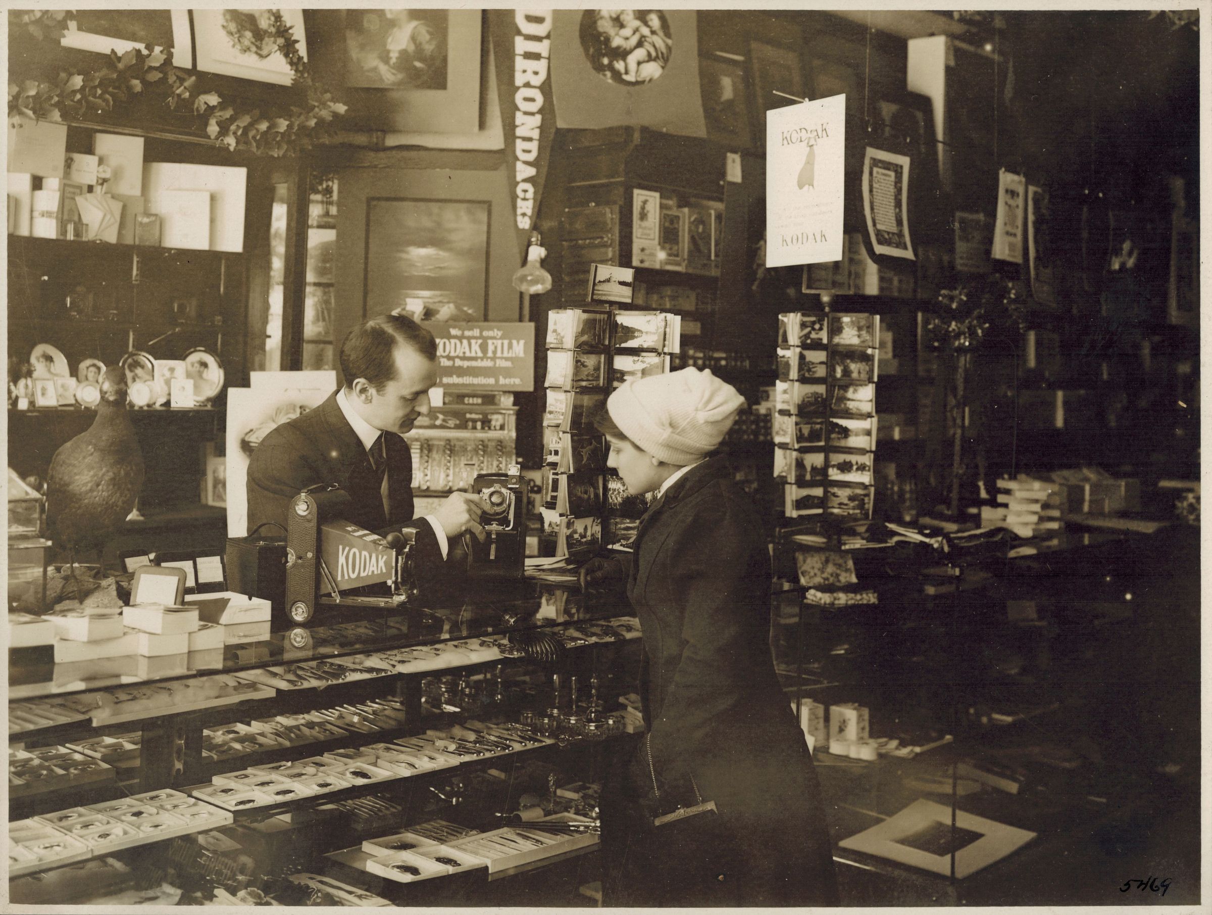 Black-and-White photograph of the interior of William Kollecker's Kodak and Gift Shop in the larger center section of the Coulter Block. William Kollecker is standing behind the counter, showing a customer a camera. The shelves are filled with photographic prints, supplies, frames, postcards, knickknacks, and other items.