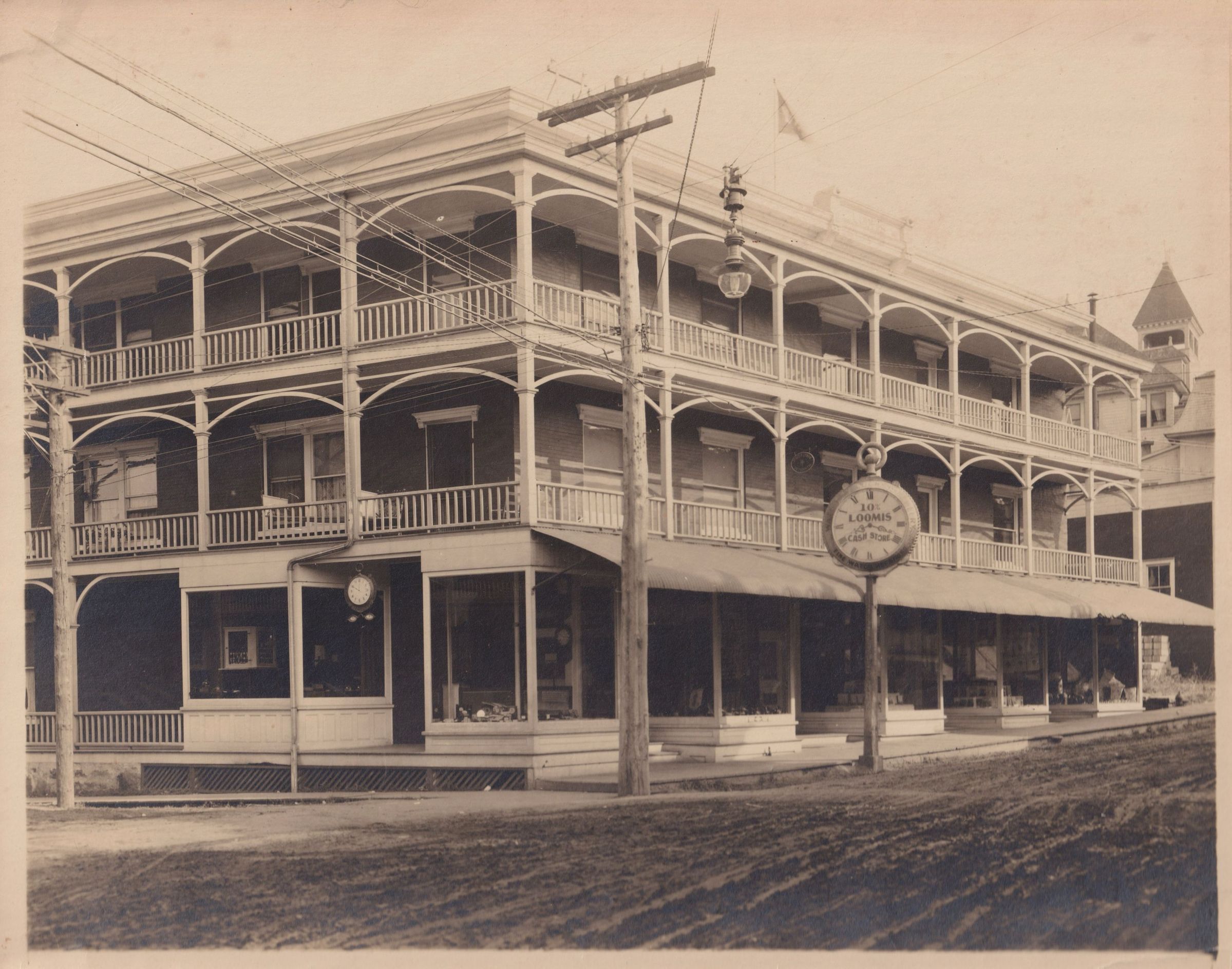 Black-and-White photograph of the Loomis Block on Broadway in downtown Saranac Lake, undated. The building has three stories, with storefronts on the first and railings on the outside of walkways on the second and third. This photograph was taken prior to the fire that destroyed the third floor in the 1920s. A large clock on a pole out front is styled to look like a pocket watch. The face of the watch reads, "10% Loomis Cash Store." A second clock hangs from the side of the building with a "pince-nez" style pair of glasses hanging below. The road in front of the store appears to be dirt. The photograph was taken from Broadway, looking at the front and side of the block along Broadway and Woodruff Street.
