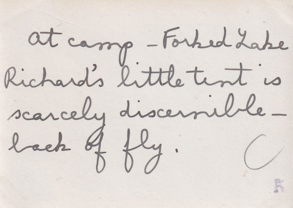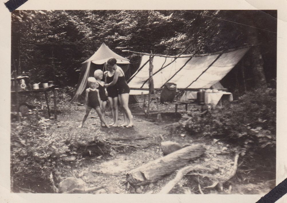 Black and white photograph of a woman with three children, all in bathing suits, at a campsite at Forked Lake Campground on Long Lake. There are tents and a table behind them. "At camp - Forked Lake, Richard's little tent is scarcely discernible - lack of fly" is handwritten on the back of the photograph.