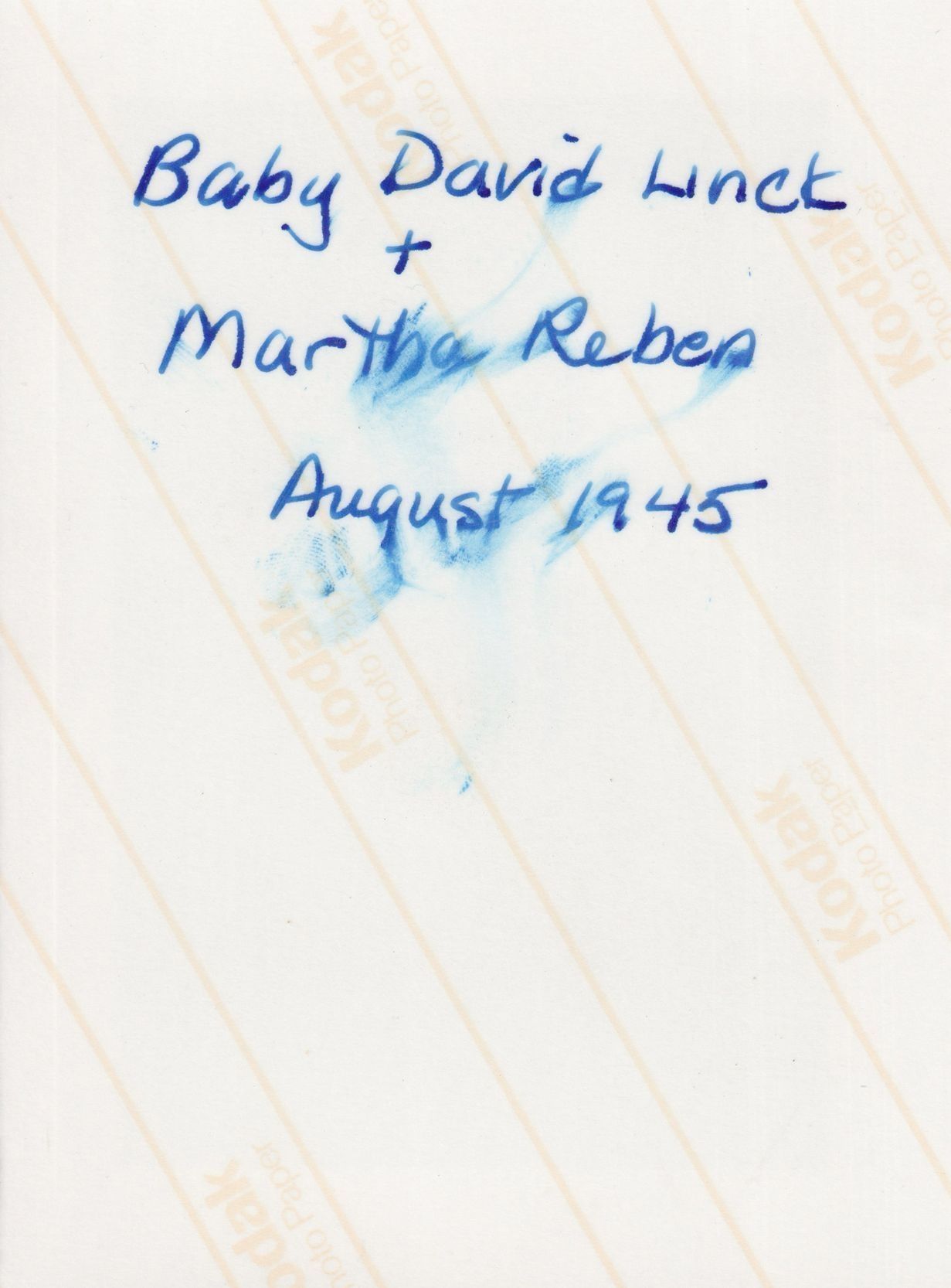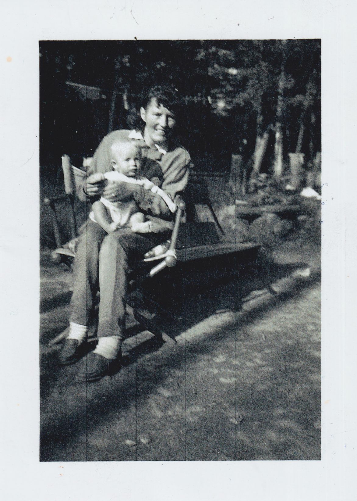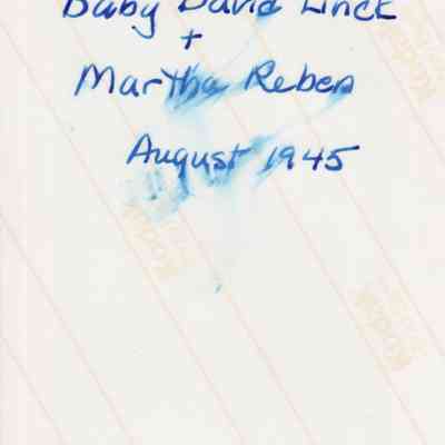 Black and white photograph of a woman sitting on a camp chair with a baby in her lap. There is more of a campsite visible behind them. A handwritten caption on the back of the photograph reads "Baby David Linck + Martha Reben August 1945."