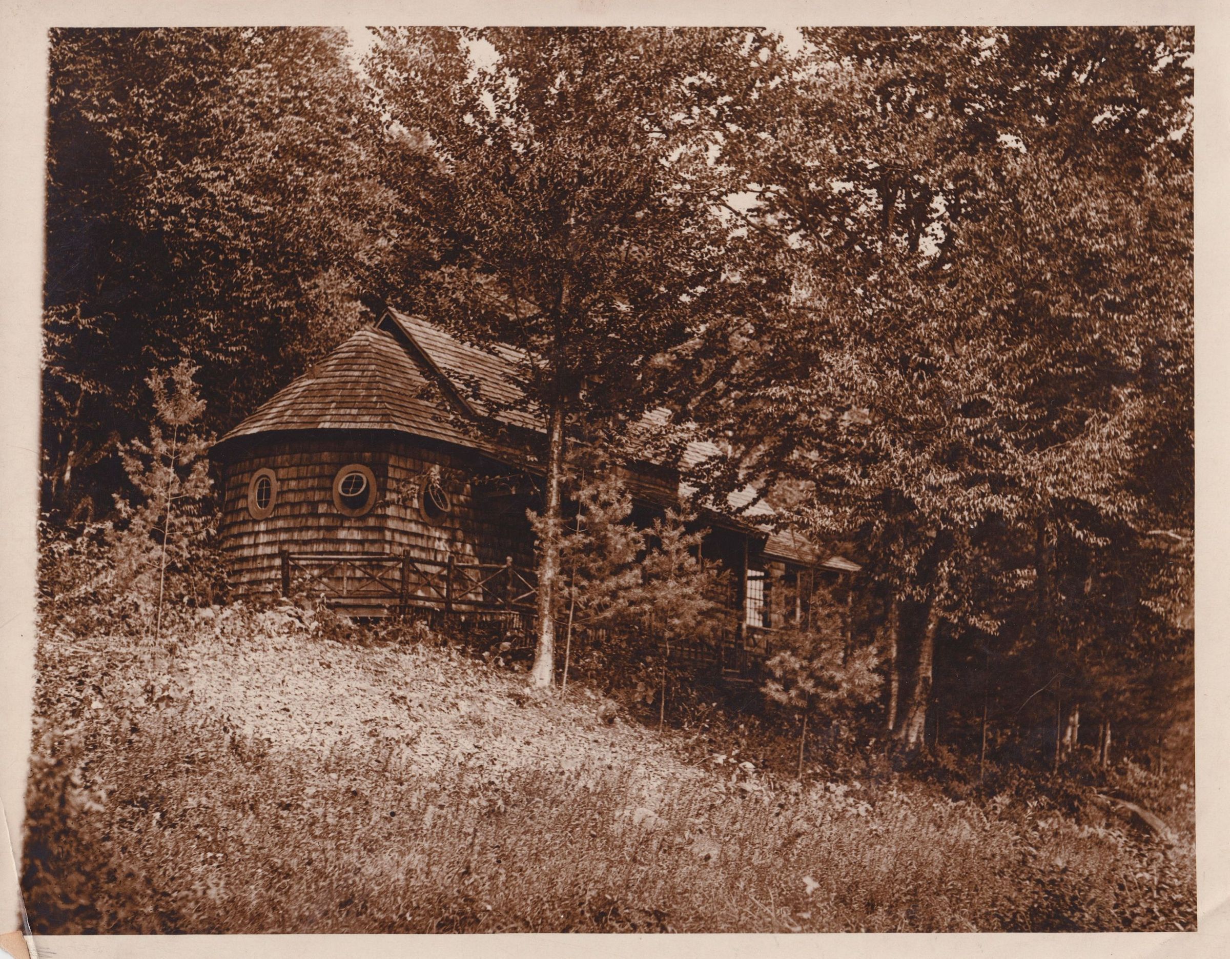 Sepia-toned black and white photograph of a cabin at the Veterans Mountain Camp in Tupper Lake. The cabin is sitting at the edge of a forest.