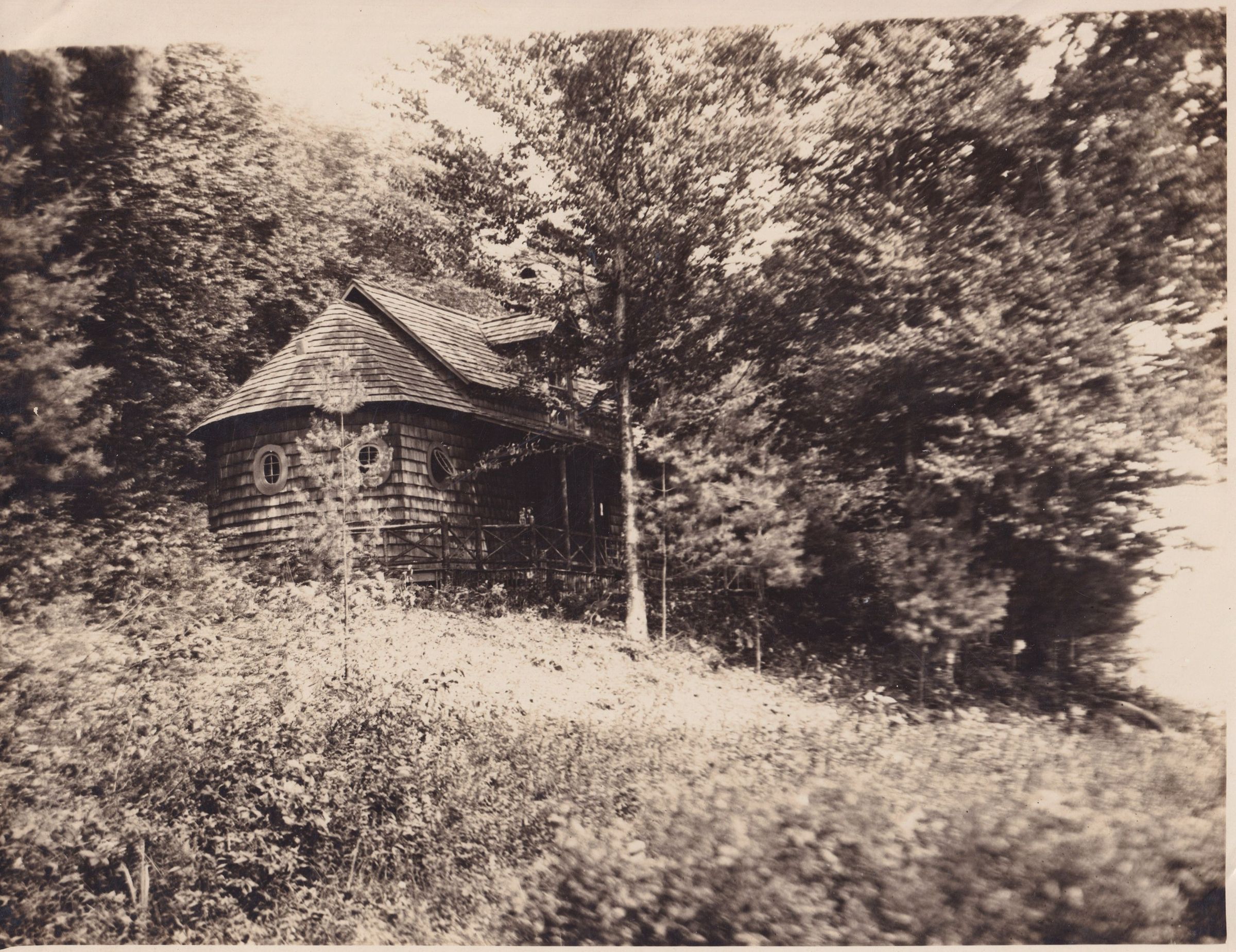 Black and white photograph of a cabin at the Veterans Mountain Camp in Tupper Lake. The cabin is sitting at the edge of a forest on a hill.