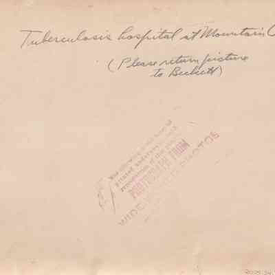 Black and white photograph of a large building at the Veterans Mountain Camp in Tupper Lake. The building is sitting next to the shoreline of Big Tupper Lake. Handwritten on the back of the photograph is "Tuberculosis hospital at Mountain Camp (Please return picture to Beckett)."