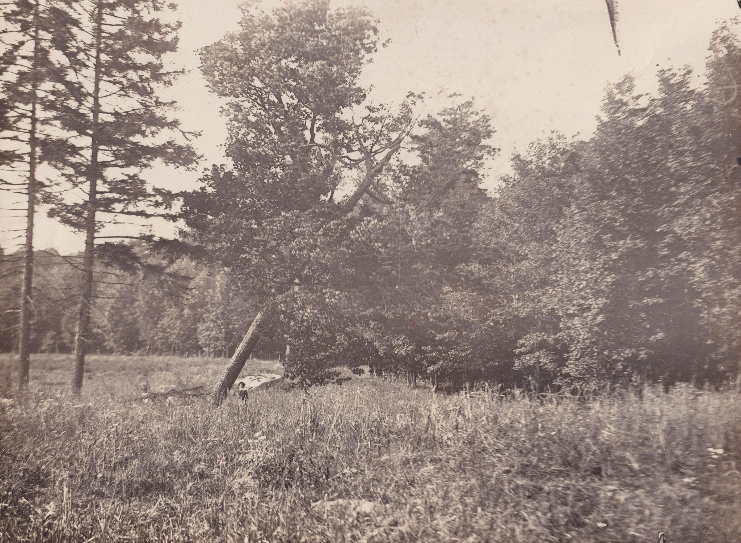 Black and white photograph of a wooded and grassy area outside. There are trees lining the right side of the picture as well as a few in the middle of the field.