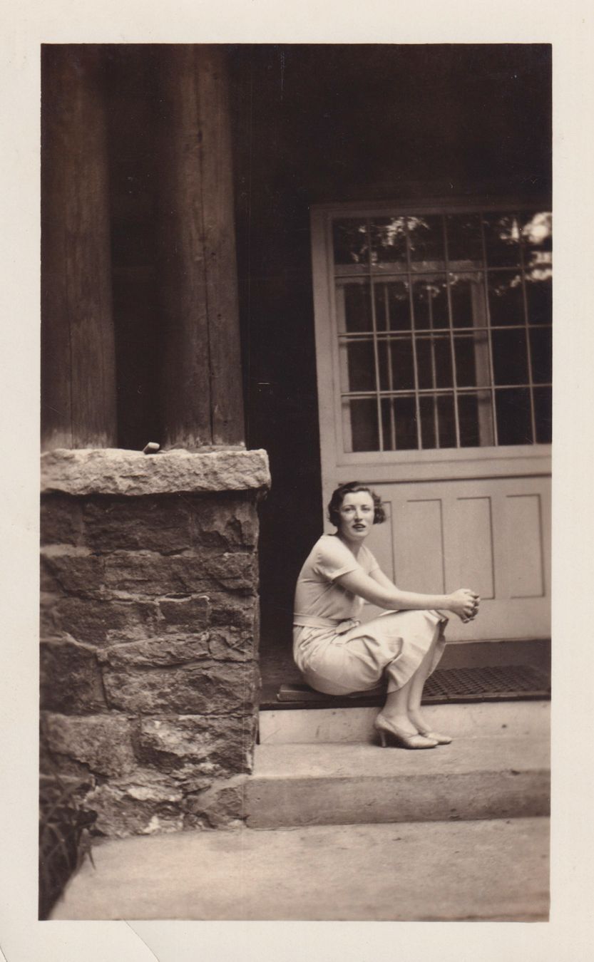 Black-and-White photograph of a woman sitting on the stone front steps of a building. There are wooden columns.