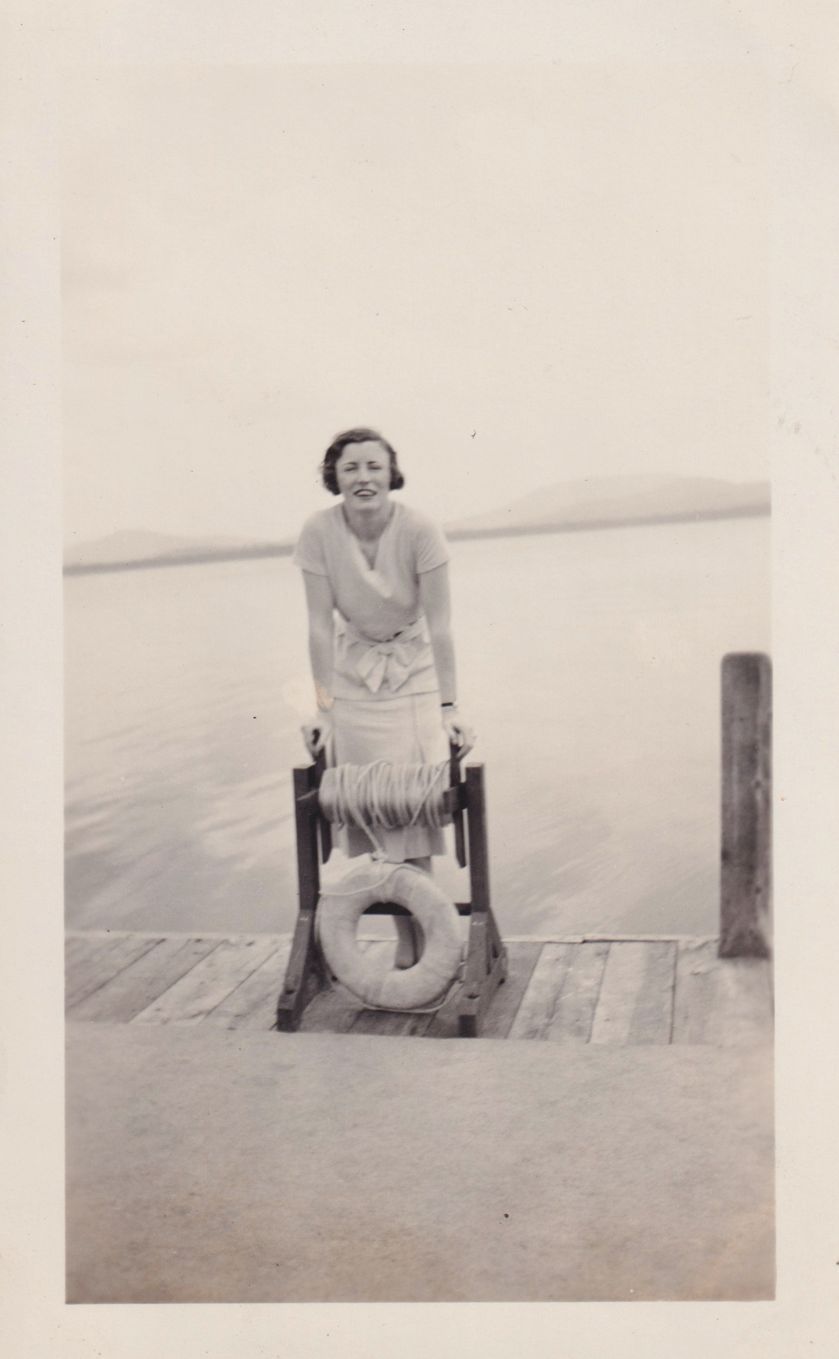 Black-and-White photograph of a woman standing on a dock with her hands on a lifesaver ring station. There is a lake behind her.