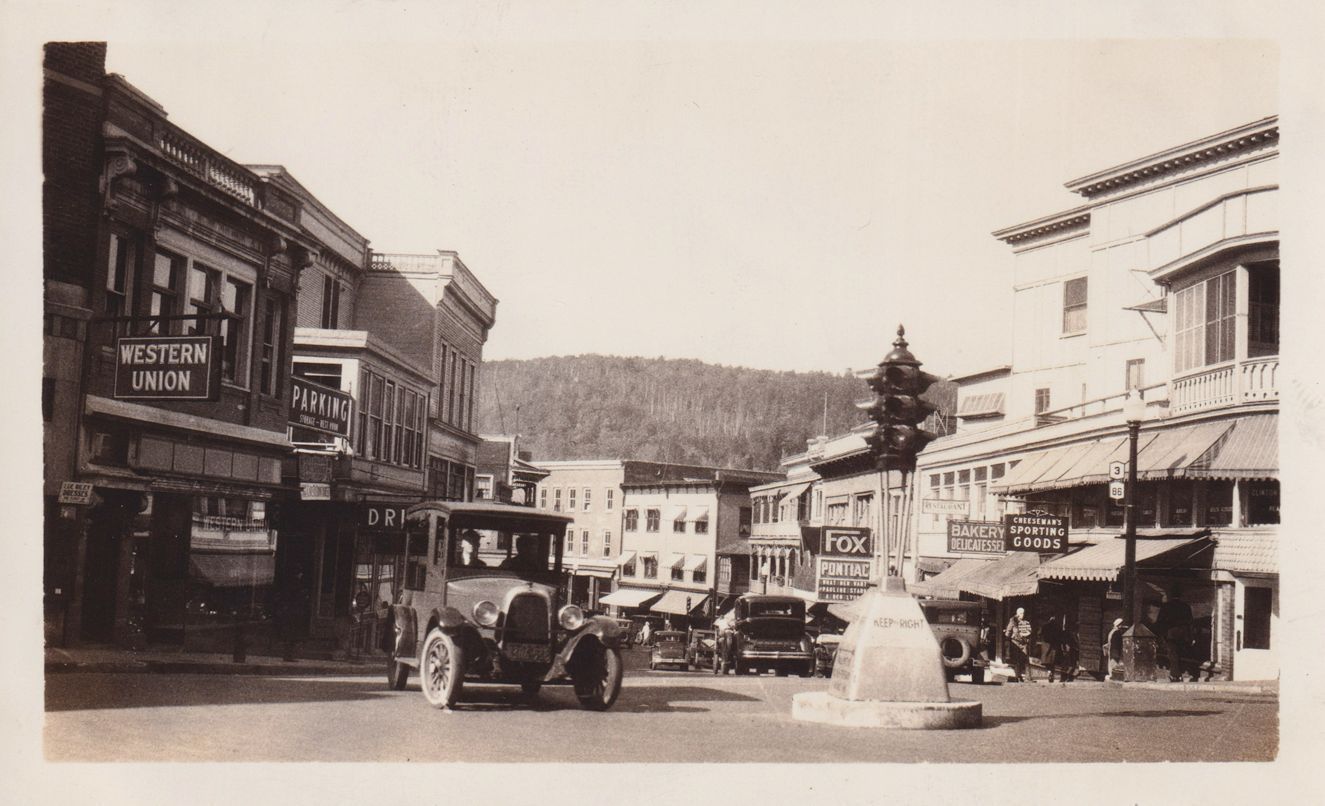 Black-and-White photograph of the Main Street and Broadway intersection, looking down Broadway. There is a traffic light in the middle of the intersection with a car turning left onto Main Street from Broadway.