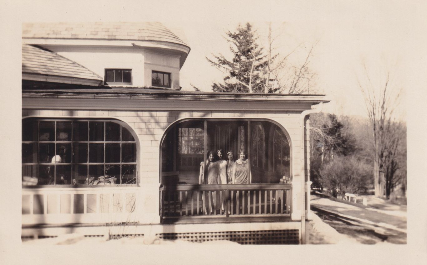 Black-and-White photograph of four young women standing on the terrace of Anderson Cottage at Trudeau Sanatorium.