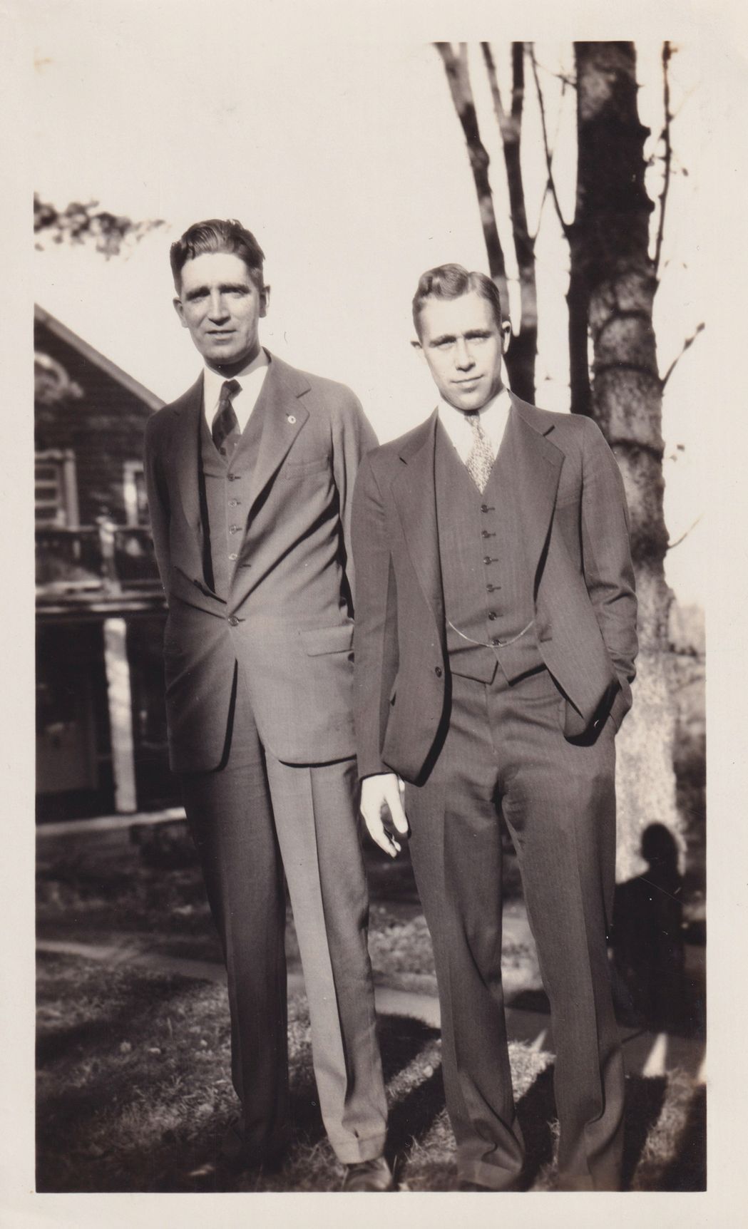 Black-and-White photograph of two unidentified men in suits standing on a grassy lawn. There is a building behind them with a second floor porch.