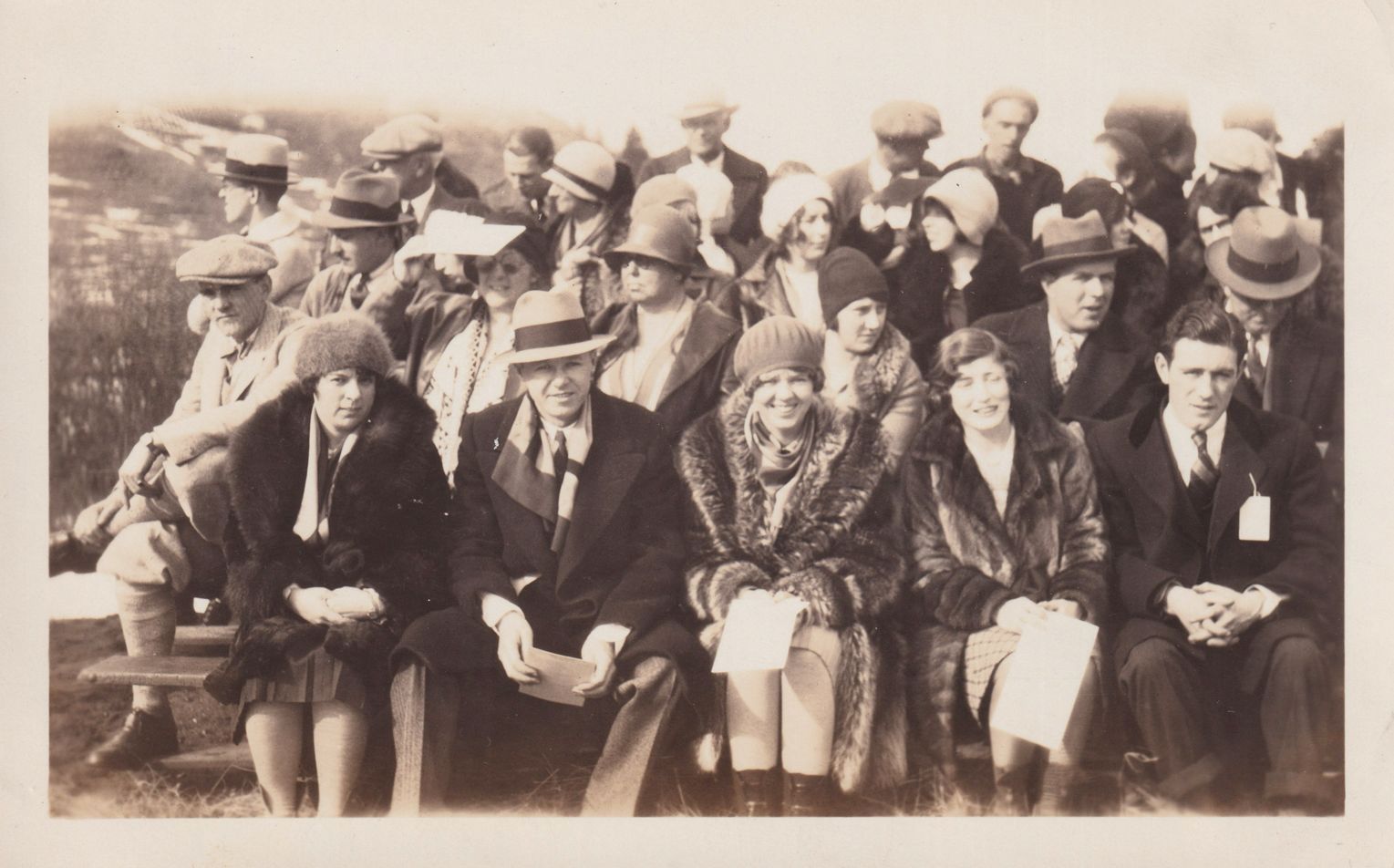 Black-and-White photograph of a crowd of people in winter gear sitting on benches arranged in stands outside. The five people on the front bench are smiling at the camera.