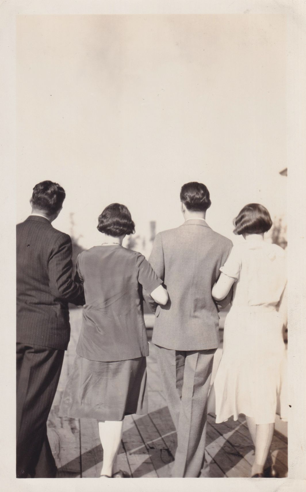 Black-and-White photograph of two women and two men standing together in a line with their arms linked, facing away from the camera. They are standing on a wooden surface.
