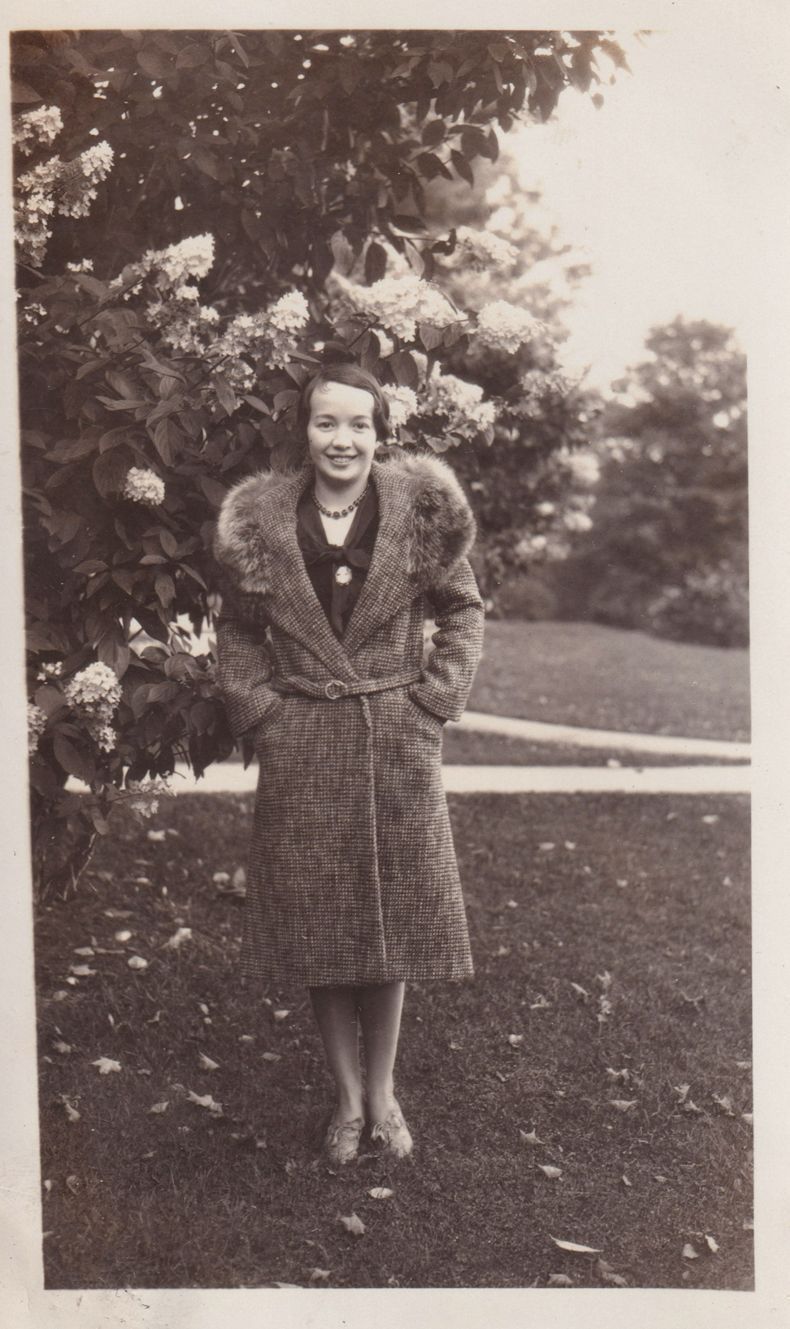 Black-and-White photograph of an unidentified woman wearing a jacket with a fur collar standing on a lawn next to a flowering hydrangea. There is a path through the lawn behind her.