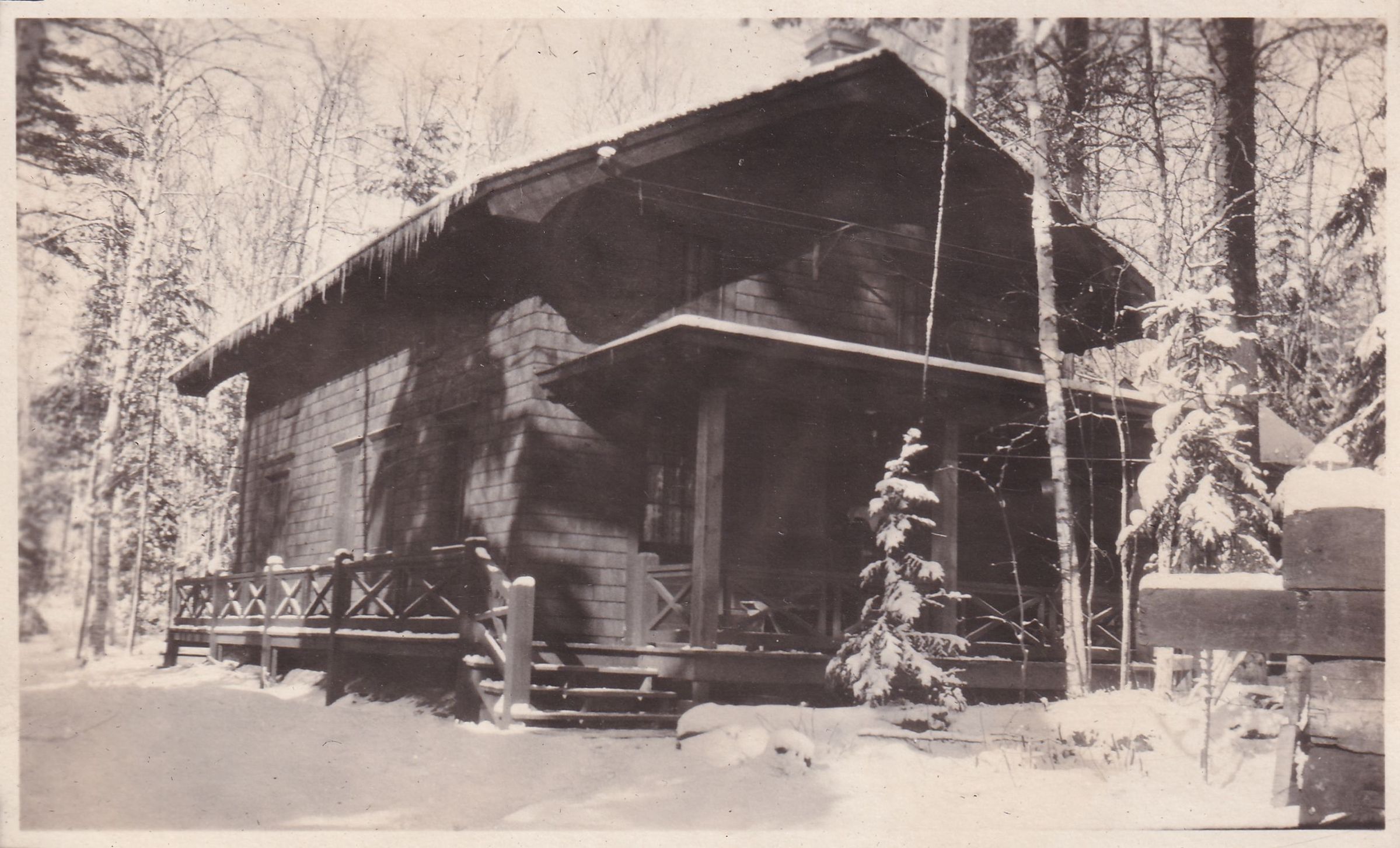 Black-and-White photograph of an unidentified camp building, likely at Northbrook Lodge, in the snow. Part of an album related to Wilfrid McDougald's farm and camp, 2020.6.1. See 2020.6.1.1 - 2020.6.1.22 for photographs in the album.