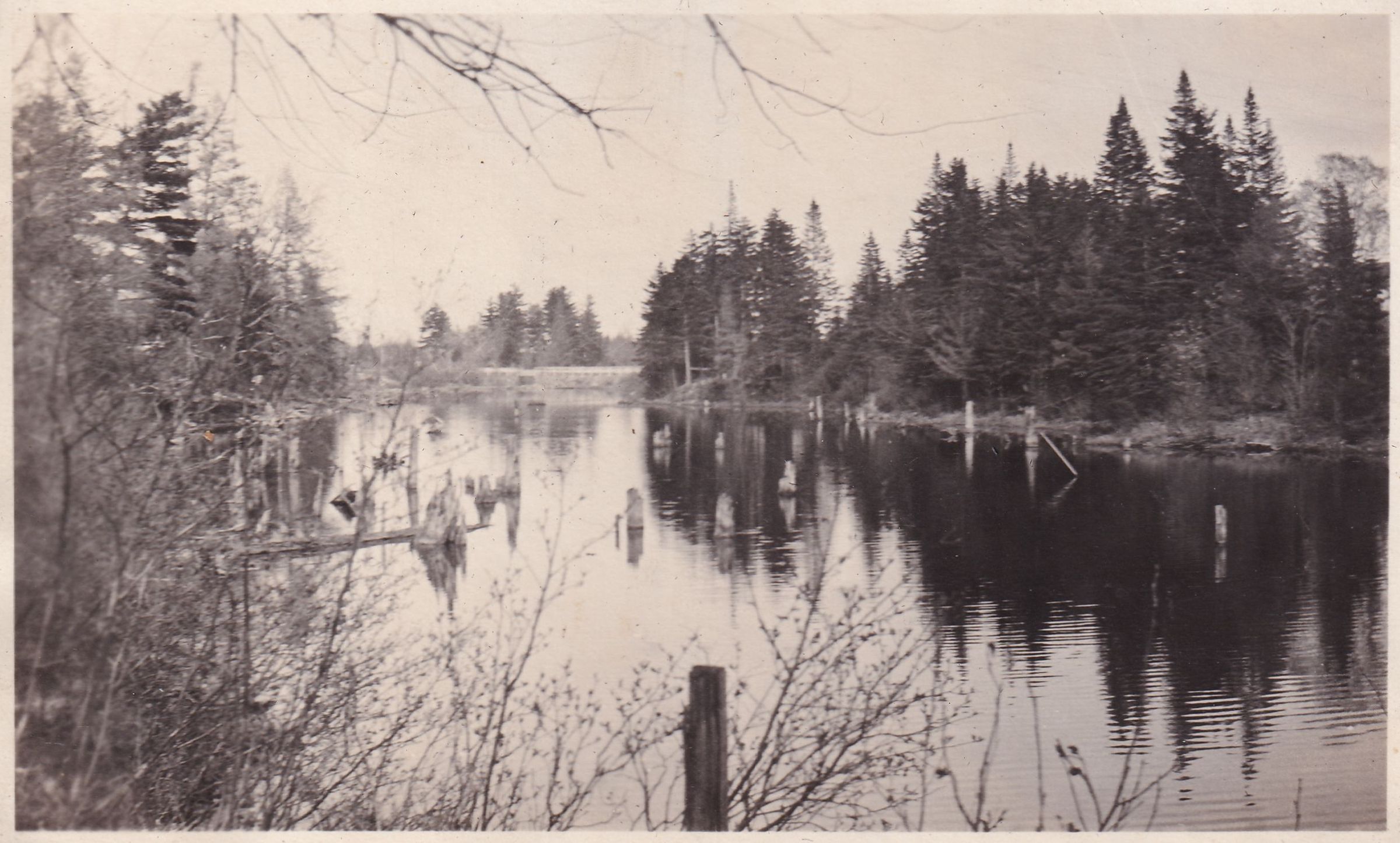 Black-and-White photograph of an unidentified body of water or river. Part of an album related to Wilfrid McDougald's farm and camp, 2020.6.1. See 2020.6.1.1 - 2020.6.1.22 for photographs in the album.