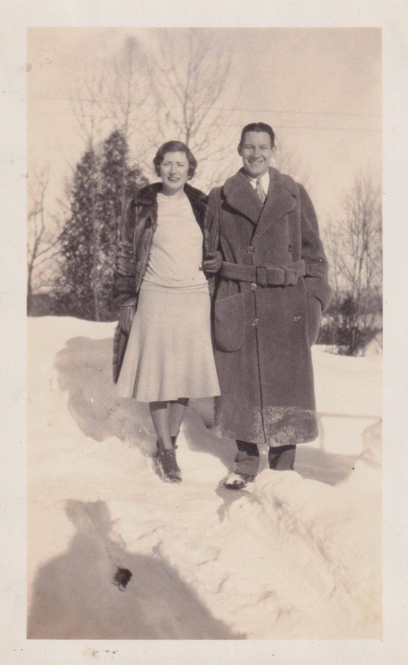 Black-and-White photograph of Frances O'Brien and Stevenson Waltien standing together in winter coats on a snow-covered path, likely at Trudeau Sanatorium. There are trees in the distance behind them.