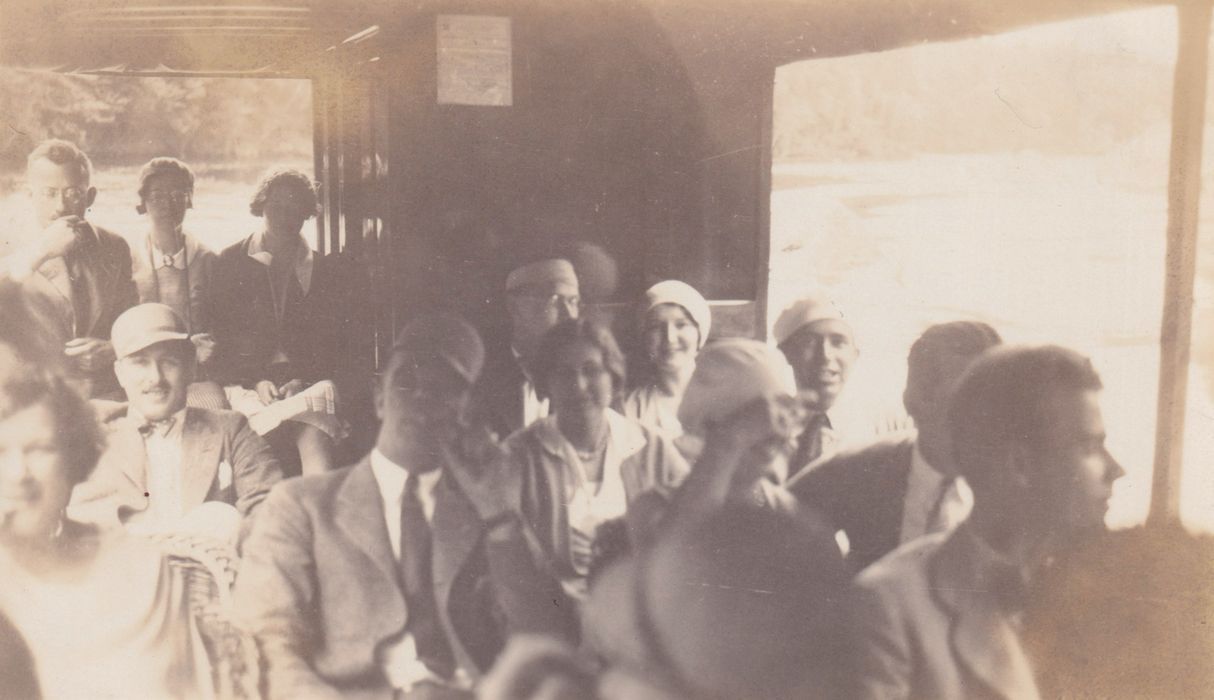 Black-and-White photograph of a group of people sitting on a ferry or other large boat. The wooded shore of the lake can be seen through the windows of the boat.