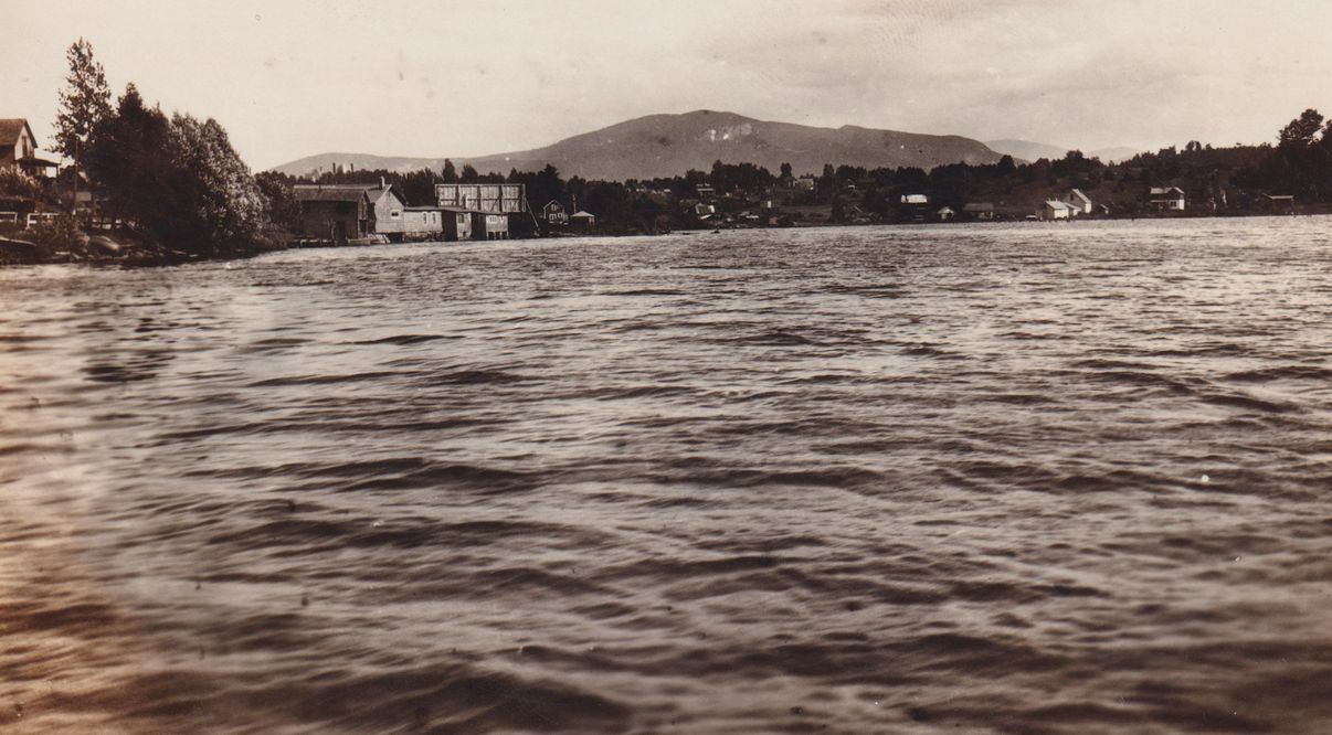 Black-and-White photograph taken from a boat on Lake Flower. Buildings at the other shoreline are visible as well as McKenzie Mountain in the distance.