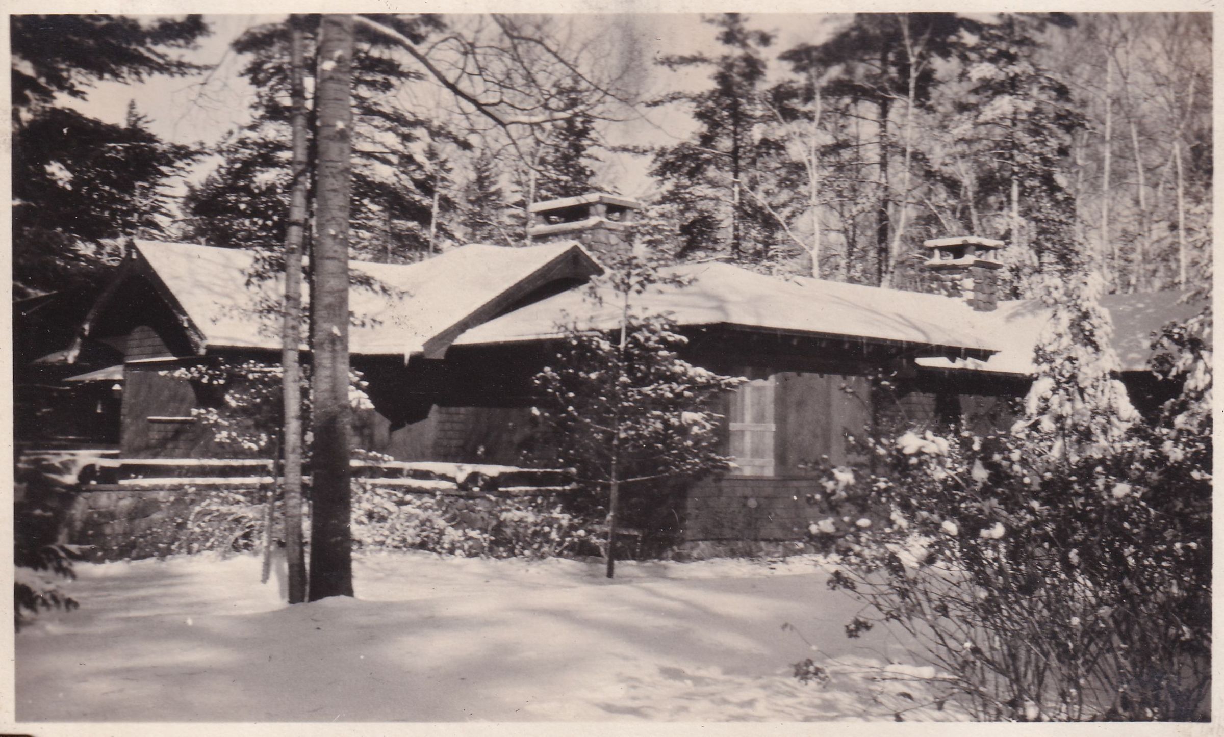 Black-and-White photograph of an unidentified camp building in the snow. Part of an album related to Wilfrid McDougald's farm and camp, 2020.6.1. See 2020.6.1.1 - 2020.6.1.22 for photographs in the album.
