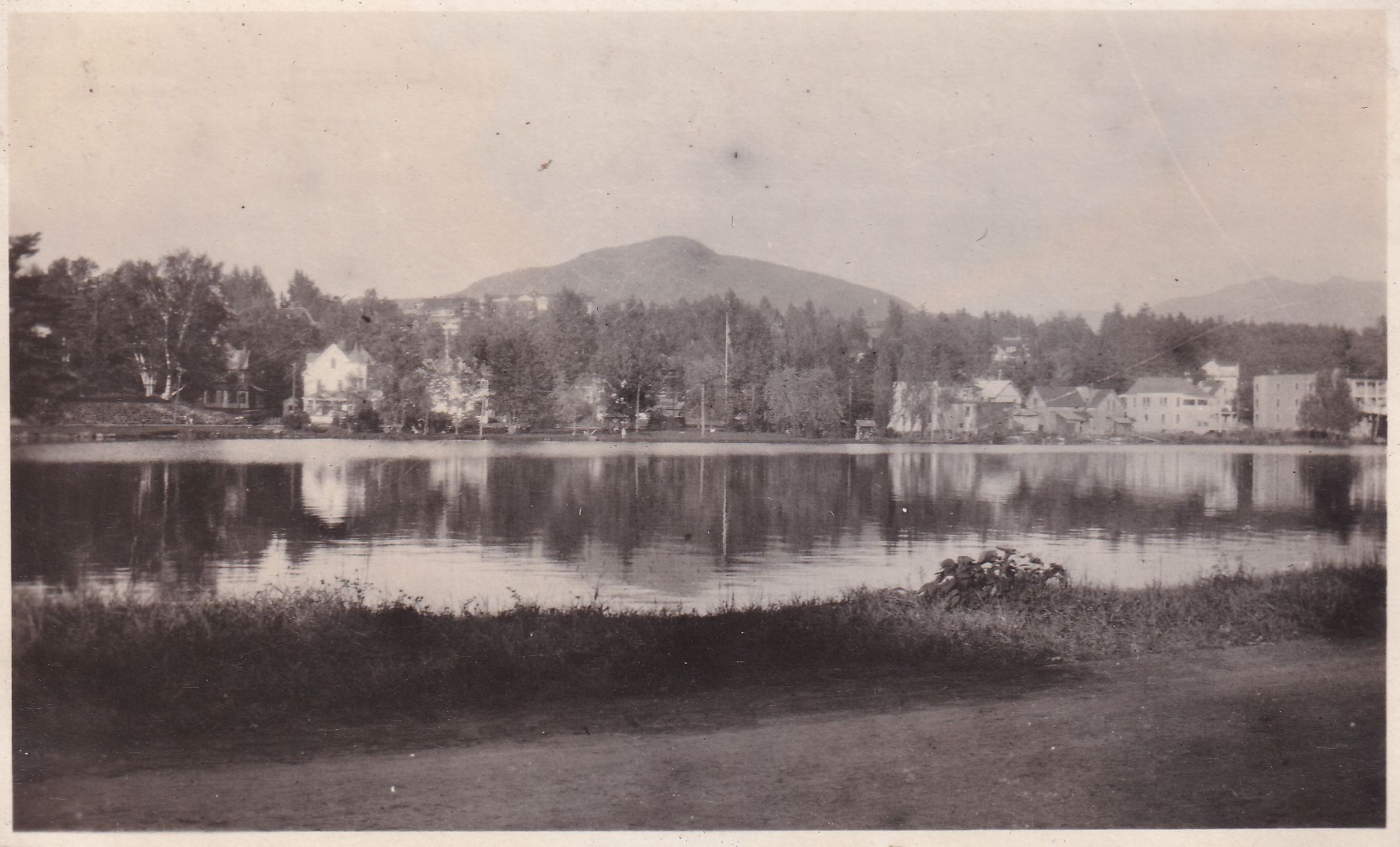 Black-and-White photograph of the view looking west across Lake Flower from Kiwassa Road. Buildings along River Street and Lake Flower Avenue can be seen on the opposite shore.