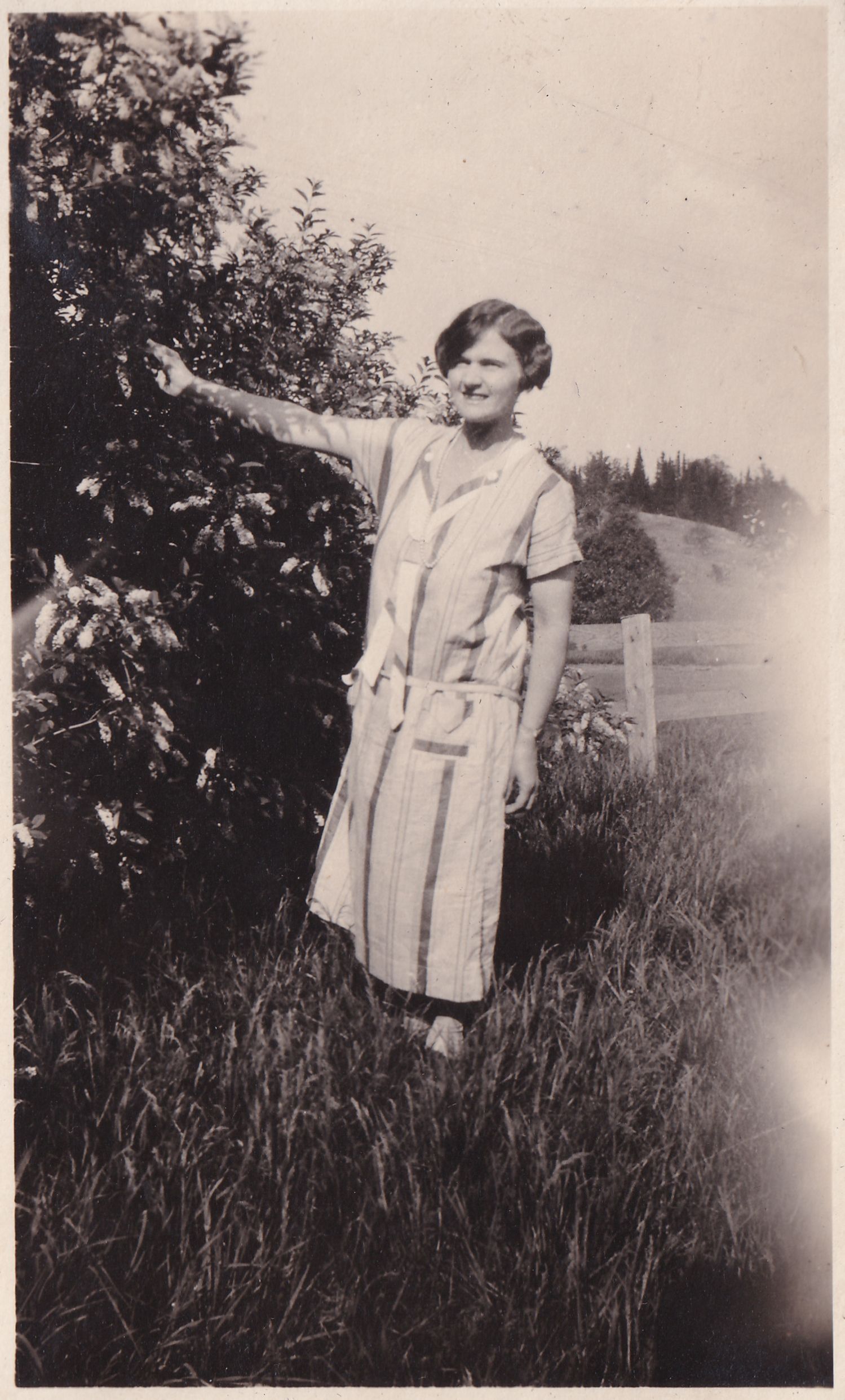 Black-and-White photograph of an unidentified woman standing next to a flowering bush or tree. She is reaching her right arm into the bush.