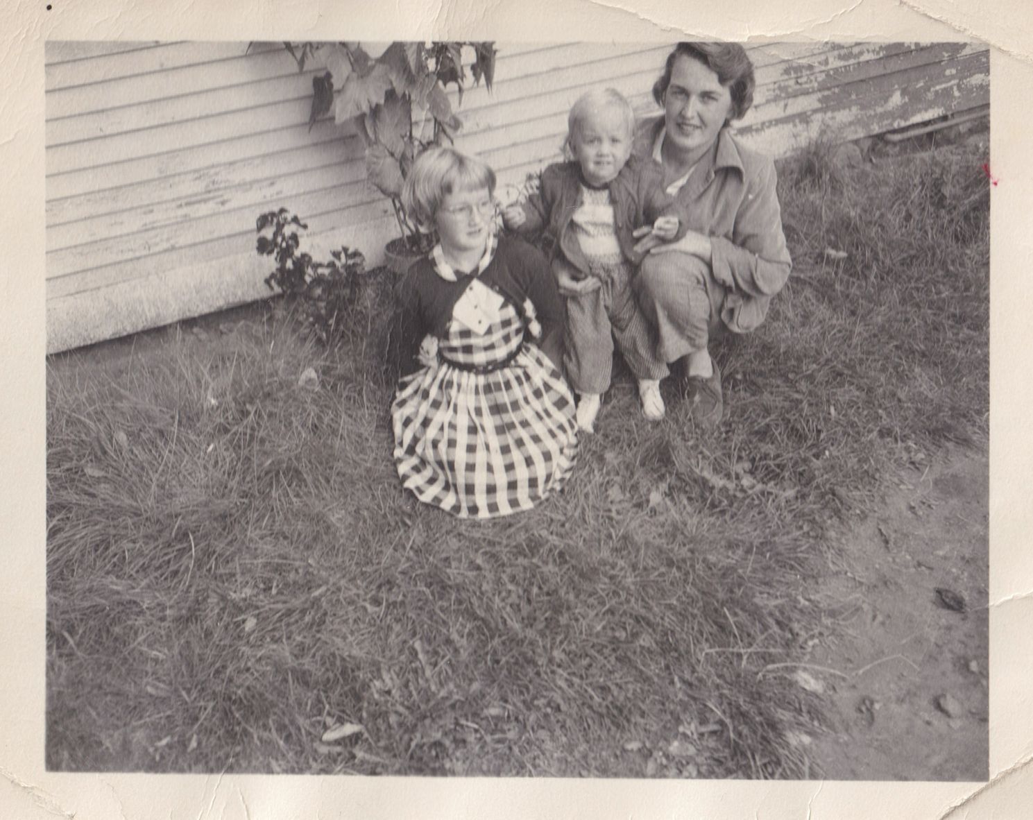 Black-and-white photograph of a woman and two young girls on the grass next to the side of a house or other building. Jeannette Davis is crouched with her daughters, Patricia and Carol, next to her. She is helping Carol stand.