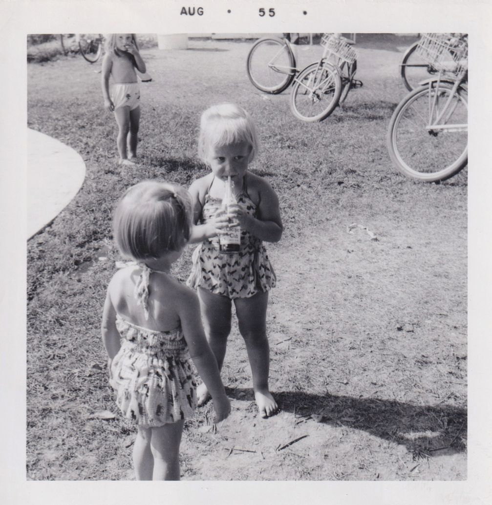 Black-and-white photograph of two young girls standing outside in bathing suits. There is another young child in the background behind them. One of the girls is drinking from a glass bottle with a straw in it. "Aug 55" is printed at the top of the photograph.