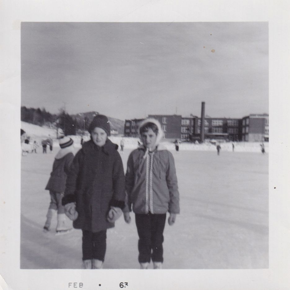 Black-and-white photograph of two girls standing side by side on an outdoor ice rink. Petrova School can be seen in the distance behind them. "Feb 63" is printed at the bottom of the photograph.