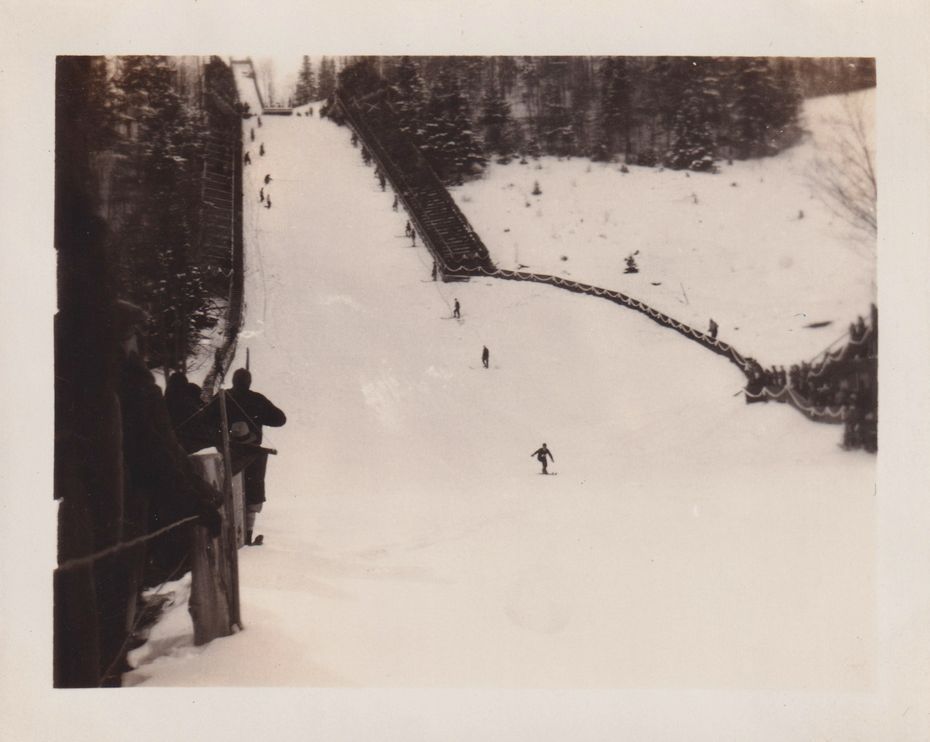 Black-and-White photograph of the downhill ski jump in Lake Placid. There are a few skiers on the sides of the hill and one in the middle who likely landed the jump.