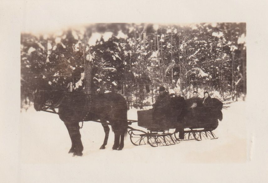 Black-and-White photograph of four people in a horse-drawn sleigh in winter. There is one dark colored horse attached to the sleigh. Stevenson Waltien and Frances O'Brien appear to be sitting in the back seat.
