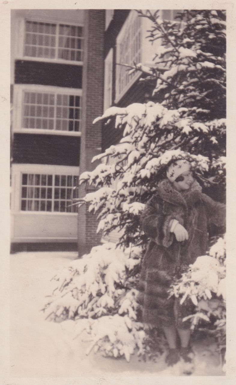Black and white photograph of a woman wearing a fur coat standing among the branches of a snow-covered tree. There is a three-story brick building behind her.