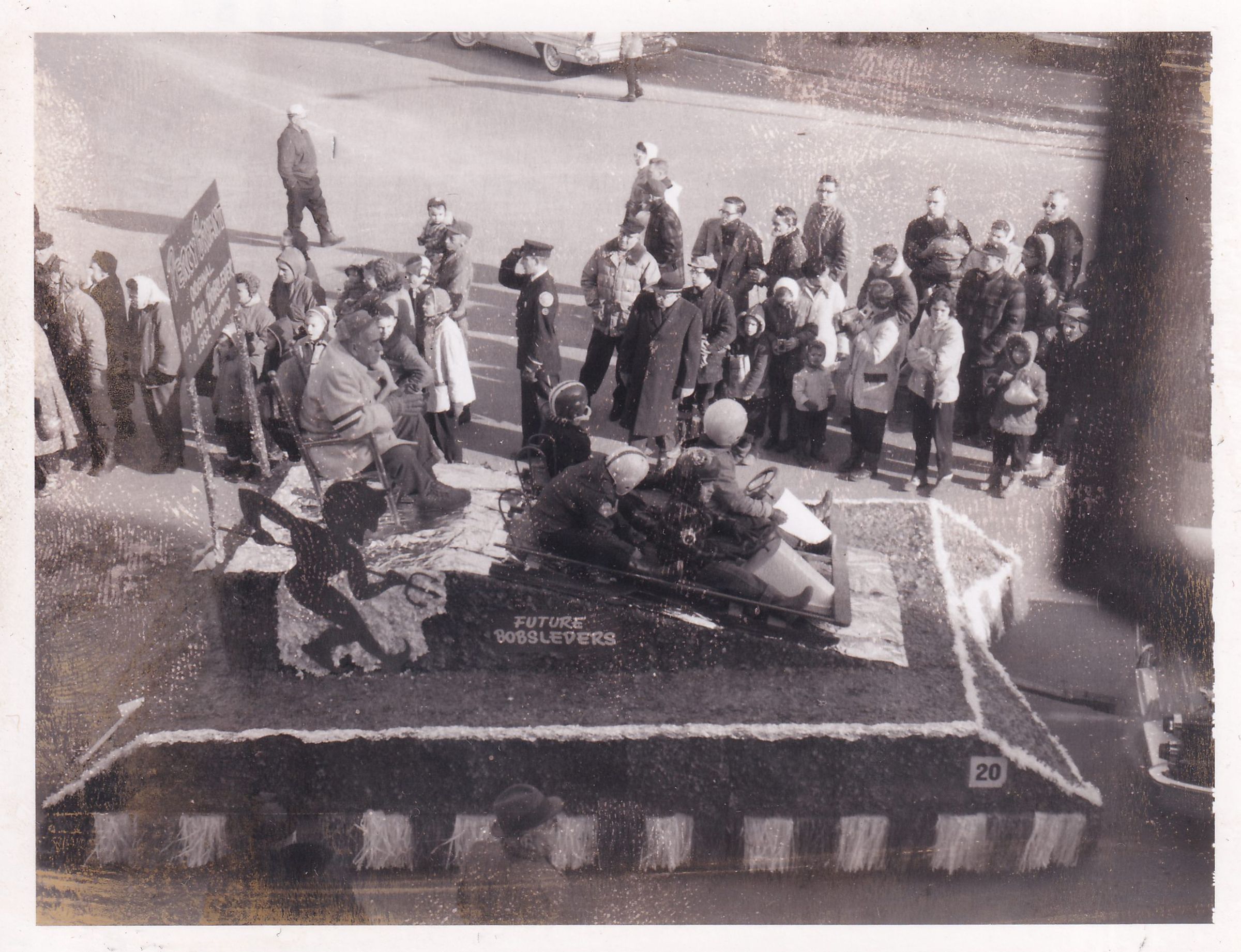 Photograph showing a float in the Winter Carnival parade. Saranac Lake Red Devils bobsledder Percy Bryant is seated at the back of the float. A sign behind him reads, "Percy Bryant, Original Red Devil Bobsleder [sic], 1932 Olympics." He is wearing an Olympic sweater. The float also features "Future Bobsleders [sic]" in sleds with the Saranac Lake Red Devils logo on the side. Crowds of people can be seen along the parade route behind the float.Lexicon
