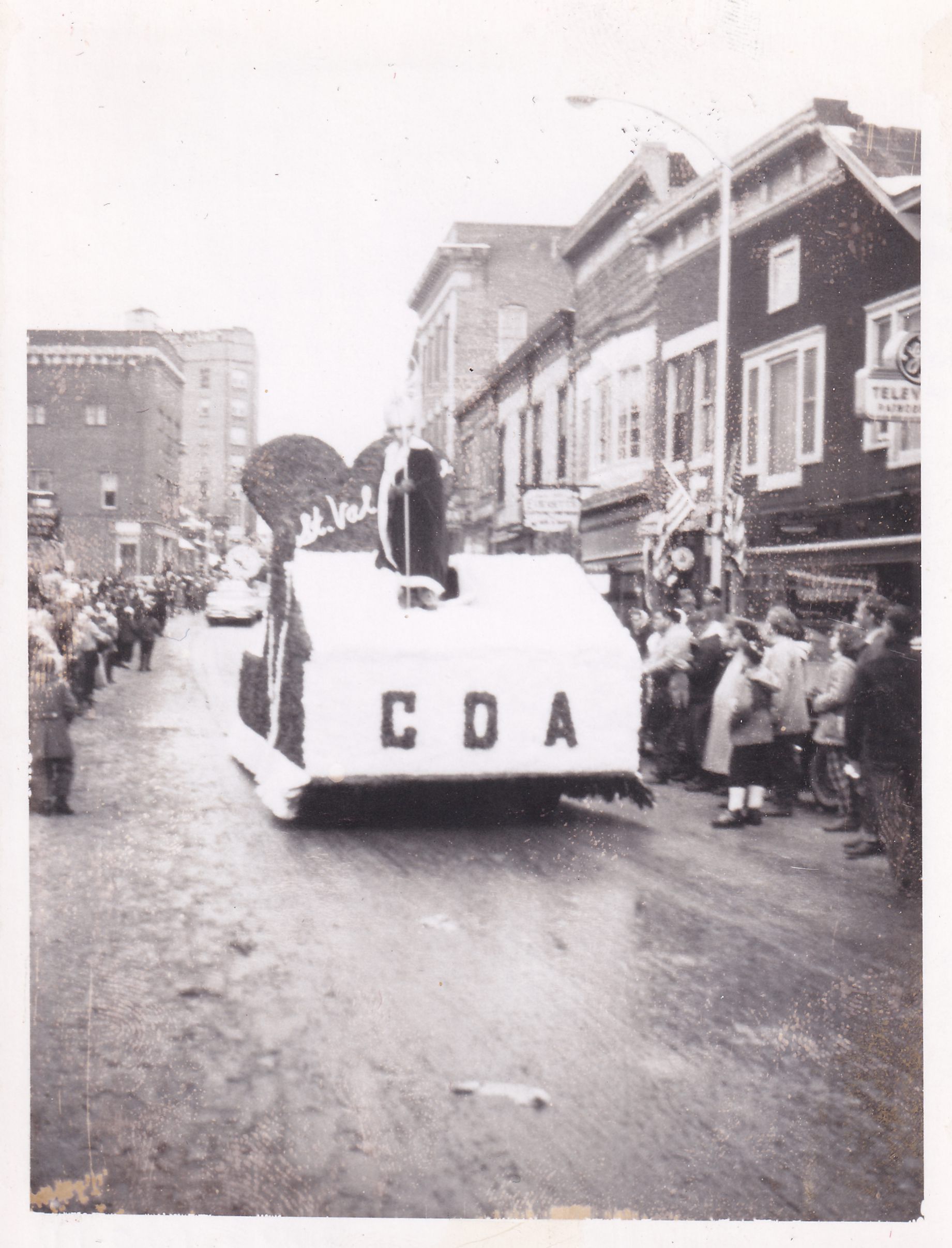 Photograph showing the Catholic Daughters of America (CDA) float in the Winter Carnival parade. A person stands at the center of the float, dressed as St. Valentine. A large heart reading "St. Val[entine]" can be seen behind them. People line the parade route, and the Masonic Temple, Alpine Hotel, Everett's Clothing, and Patnode Brothers' Television can be seen along the route.Lexicon