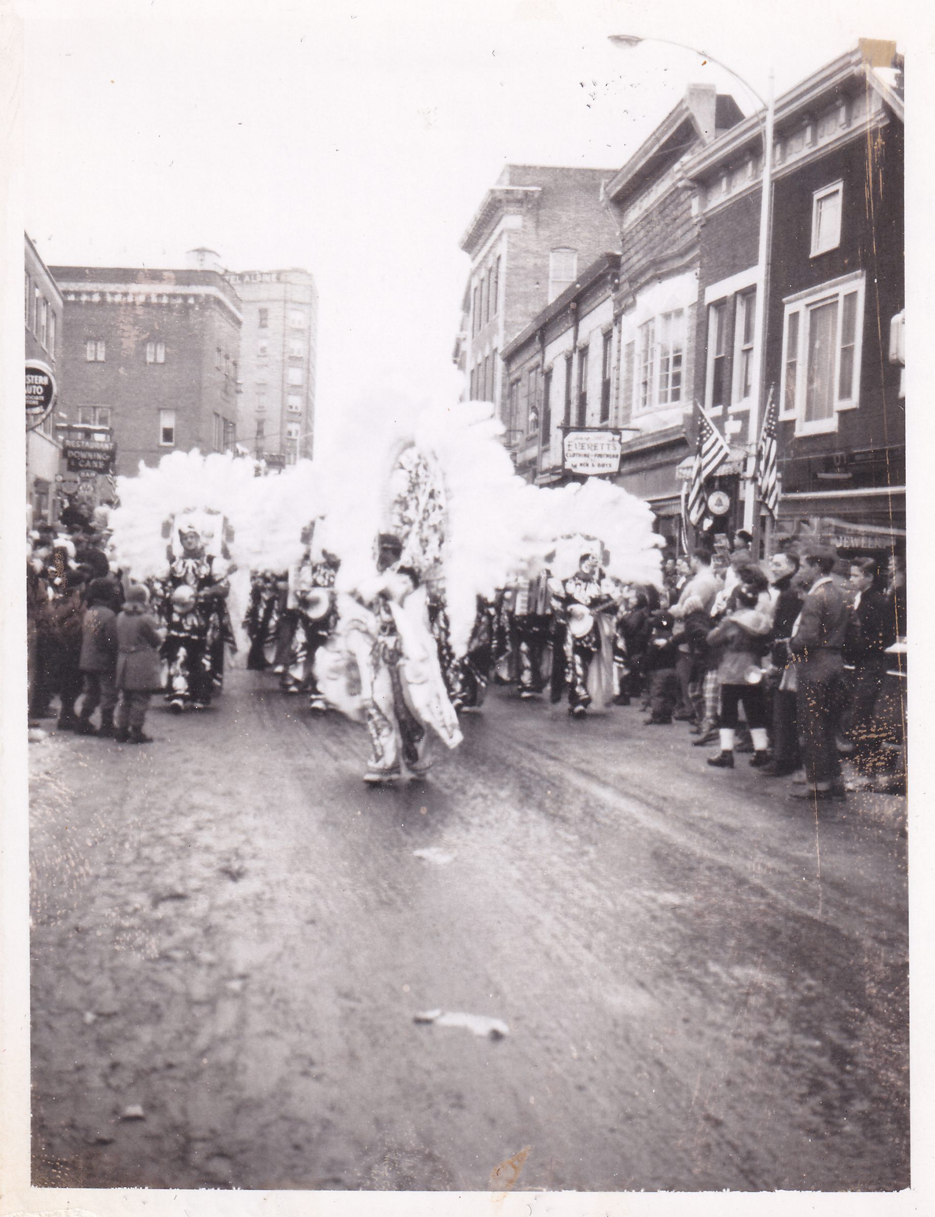 Photograph showing the "Cloverleaf String Band" [of New Jersey] marching in the Winter Carnival parade on Broadway. Most of the visible marchers are playing instruments, and all are wearing elaborately decorated costumes with large feathered headdresses. People can be seen along the parade route and the tops of buildings along Broadway can be seen above them.