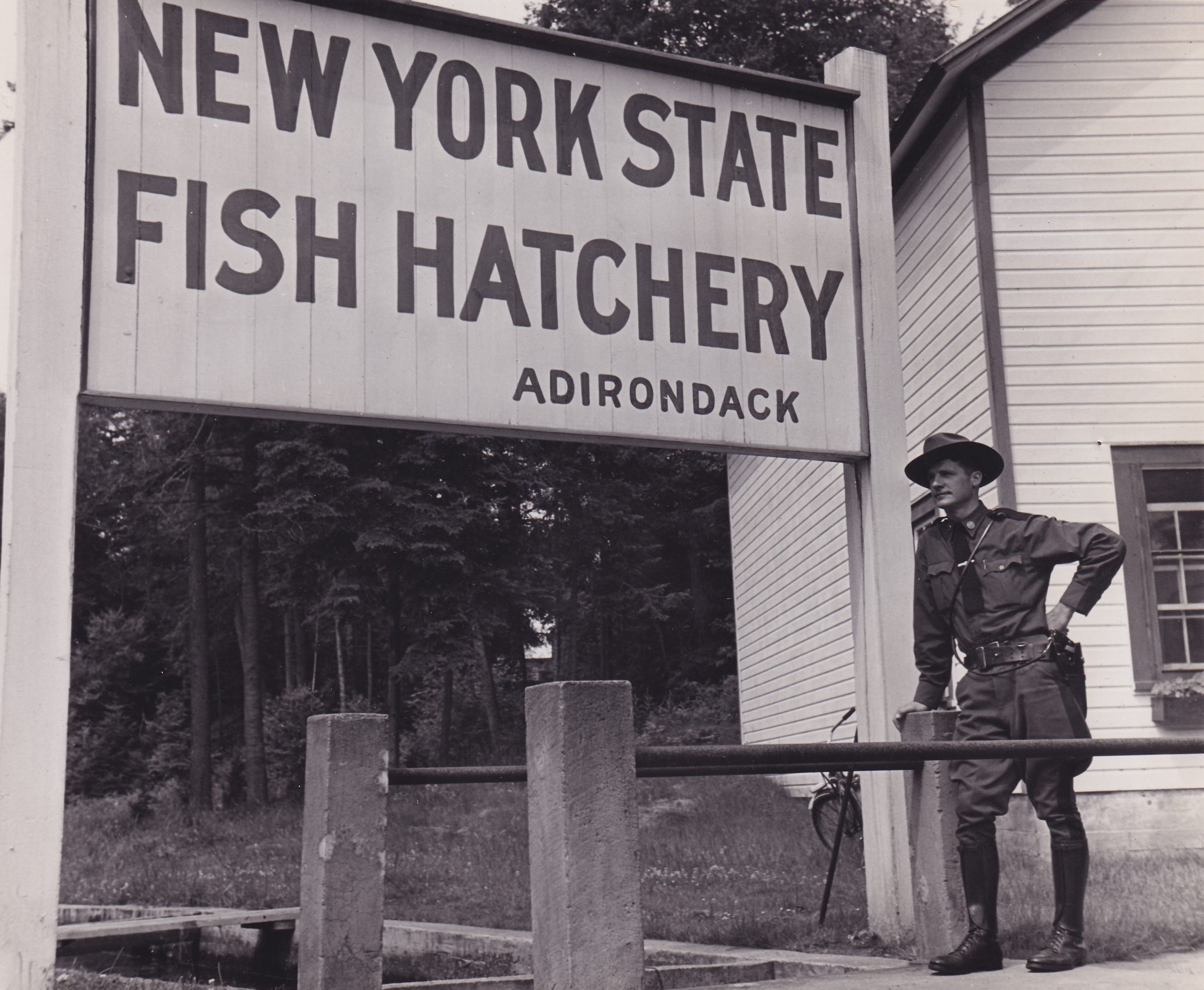 Black-and-White photograph of a man in a game warden uniform standing next to a sign for the New York State Fish Hatchery, Adirondack.Made/Created