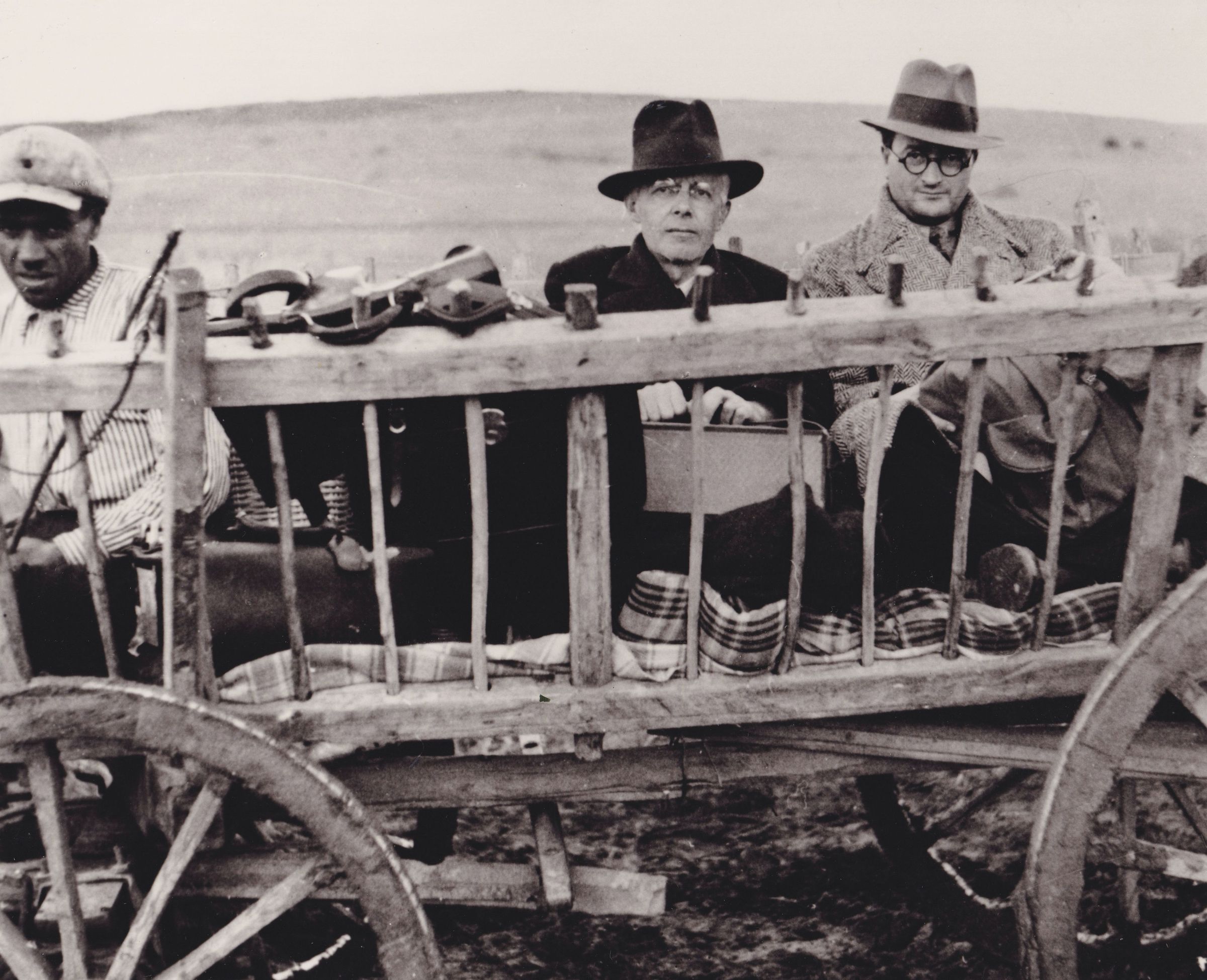 Reproduction of a photograph of Béla Bartók riding in a wagon in Turkey with two unidentified men. He is surrounded by bags and cases. This image was printed on page 148 of "My Father," by Peter Bartók.