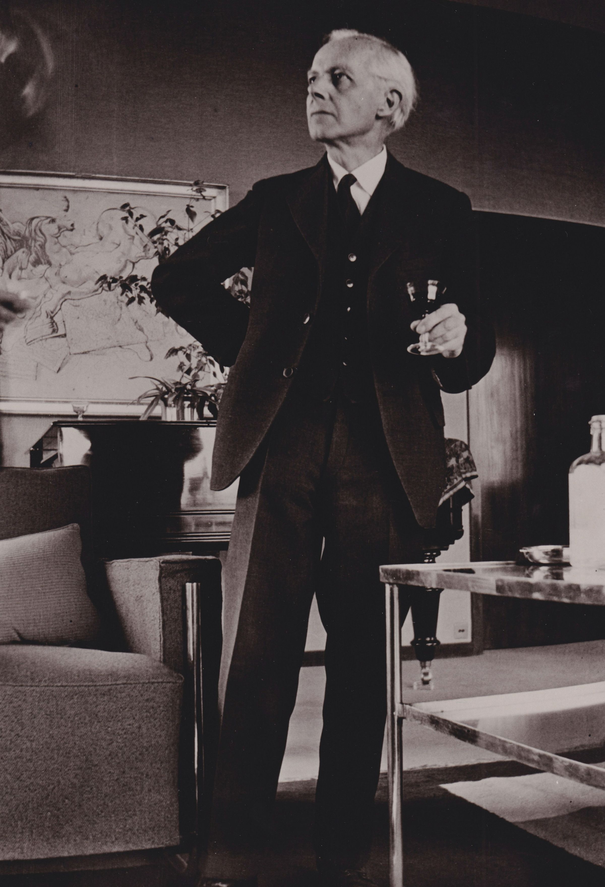 Reproduction of a candid full-length photograph of Béla Bartók. He holding a small fluted glass in his left hand.
