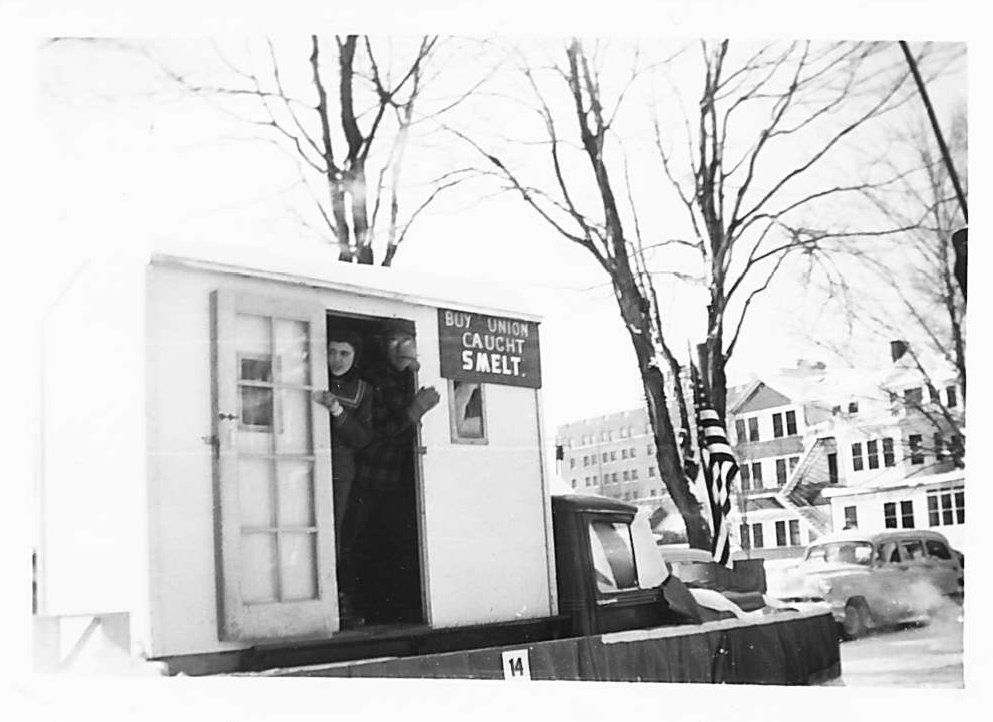 Black and white photograph of the float of the Saranac Lake Chapter of the United Brotherhood of Carpenters & Joiners of America during the 1954 Winter Carnival. There is a cabin on the float with the sign, "Buy Union Caught Smelt."
