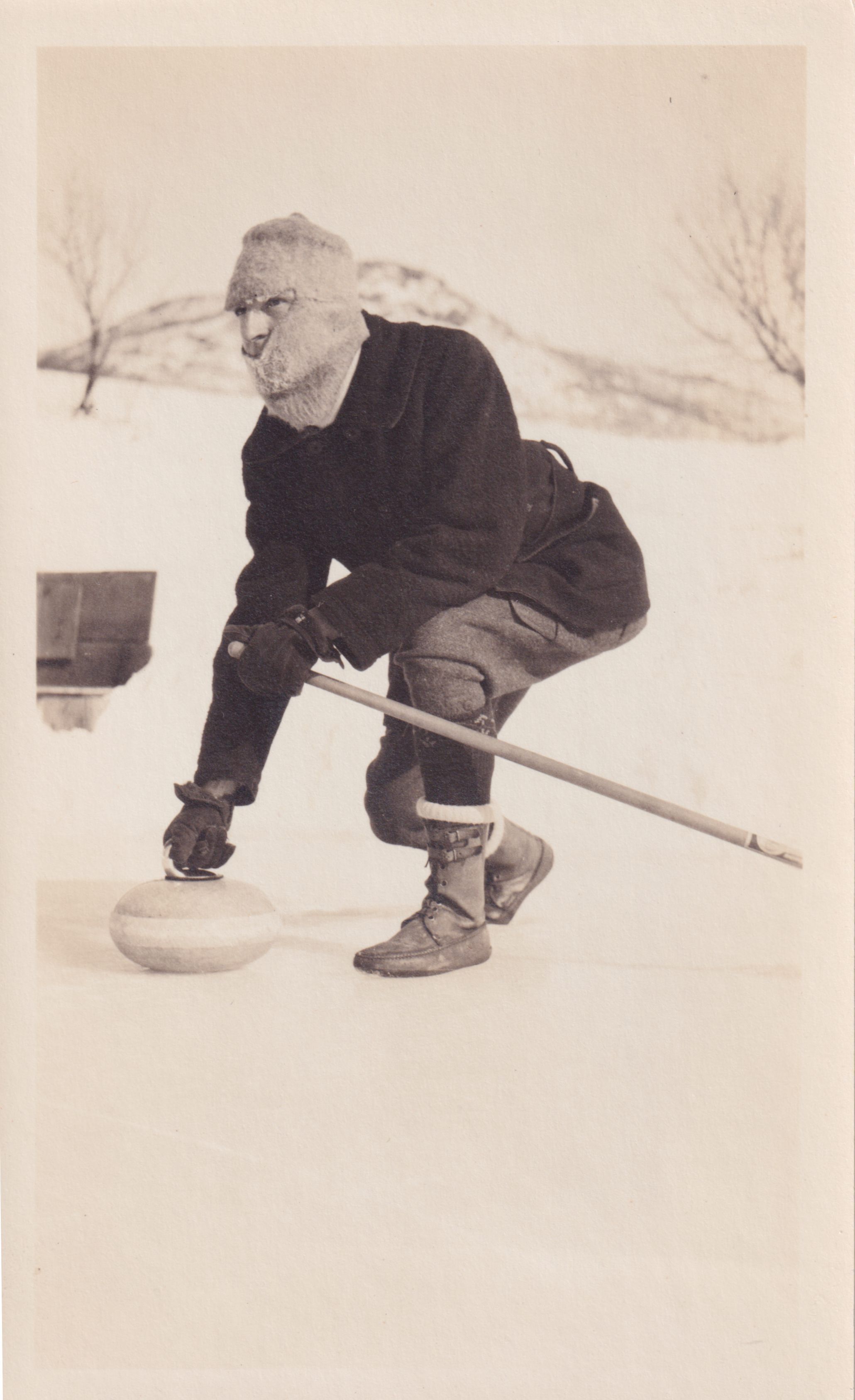 Photograph of an unidentified man preparing to release a curling stone across the ice on Moody Pond. He is holding a broom in his left hand, and wearing a balaclava that obscures most of his face.
