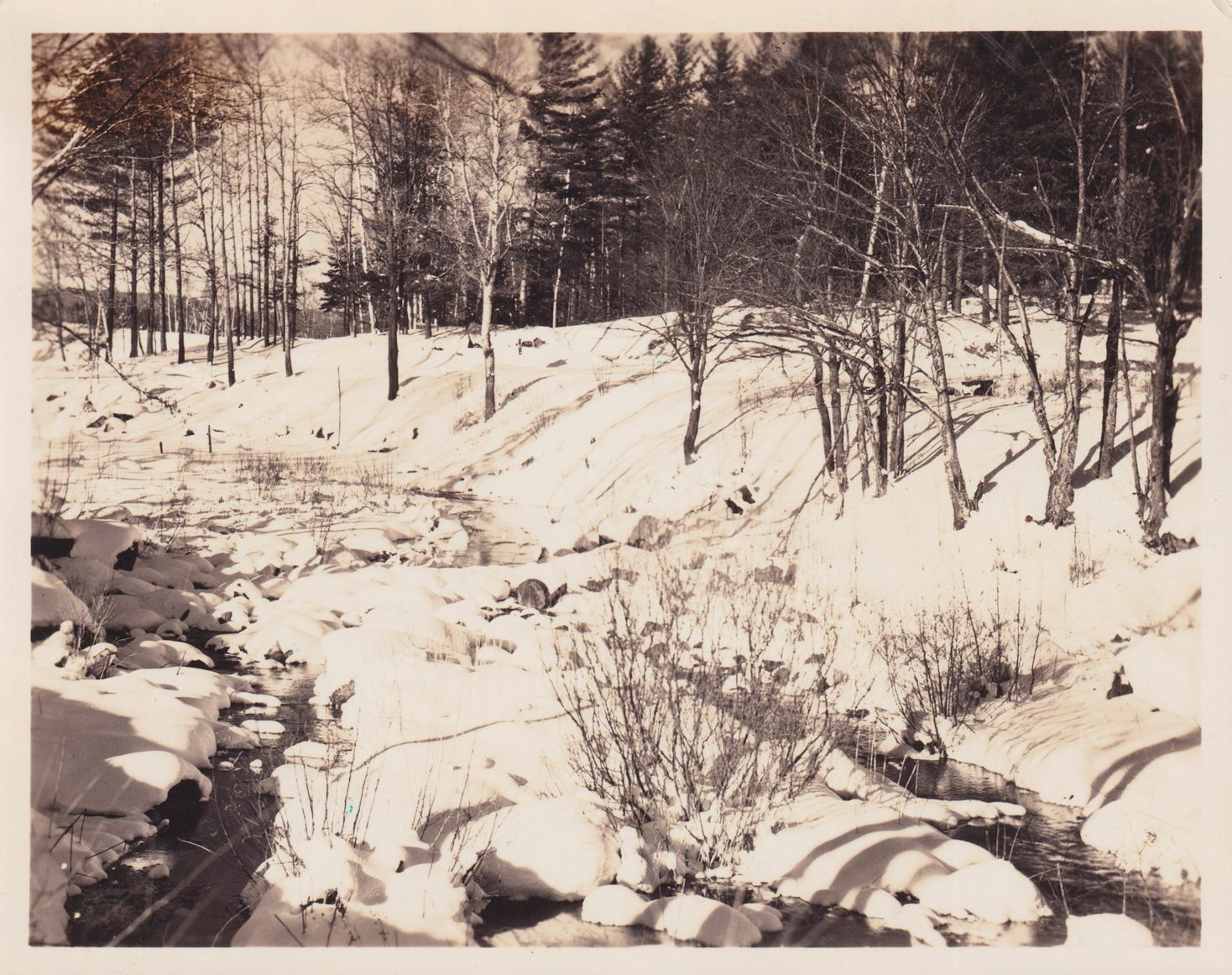 Black-and-White photograph of an unidentified snowy stream. Photograph was printed at Kollecker's Kodak and Gift Shop. Negative is 2024.2.32.Lexicon