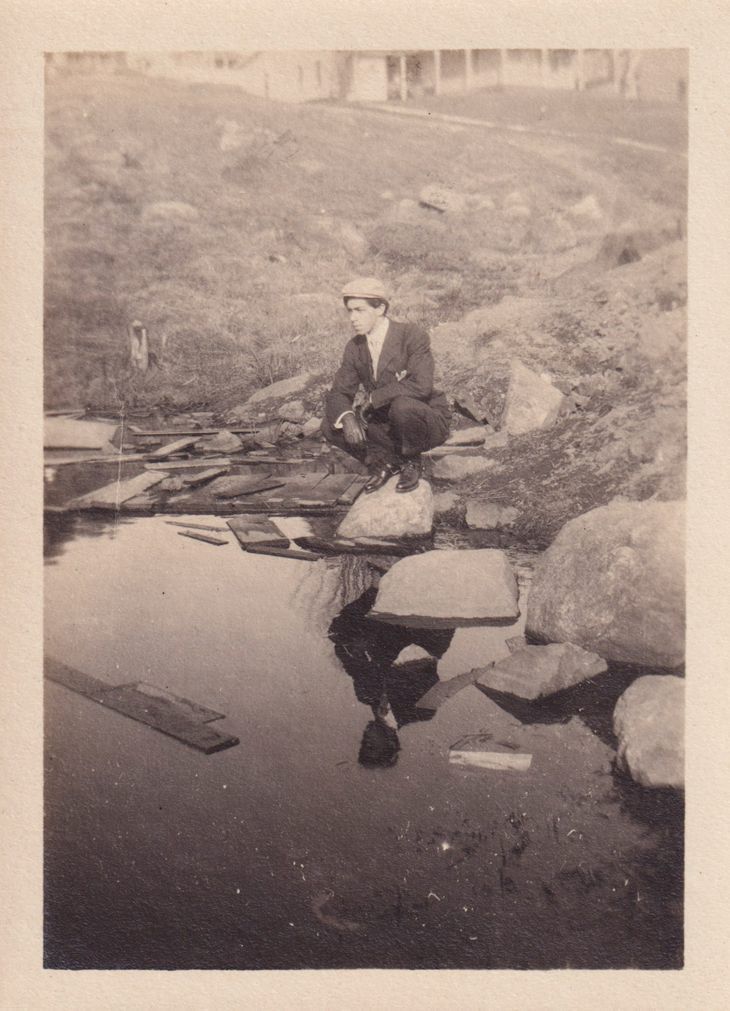 Black-and-White photograph of a man squatting down along a river. Was in an envelope marked, "Stickney - Saranac Lake." Photograph was developed by Kollecker's Kodak and Gift Shop. Negative is 2024.2.34.7.Lexicon