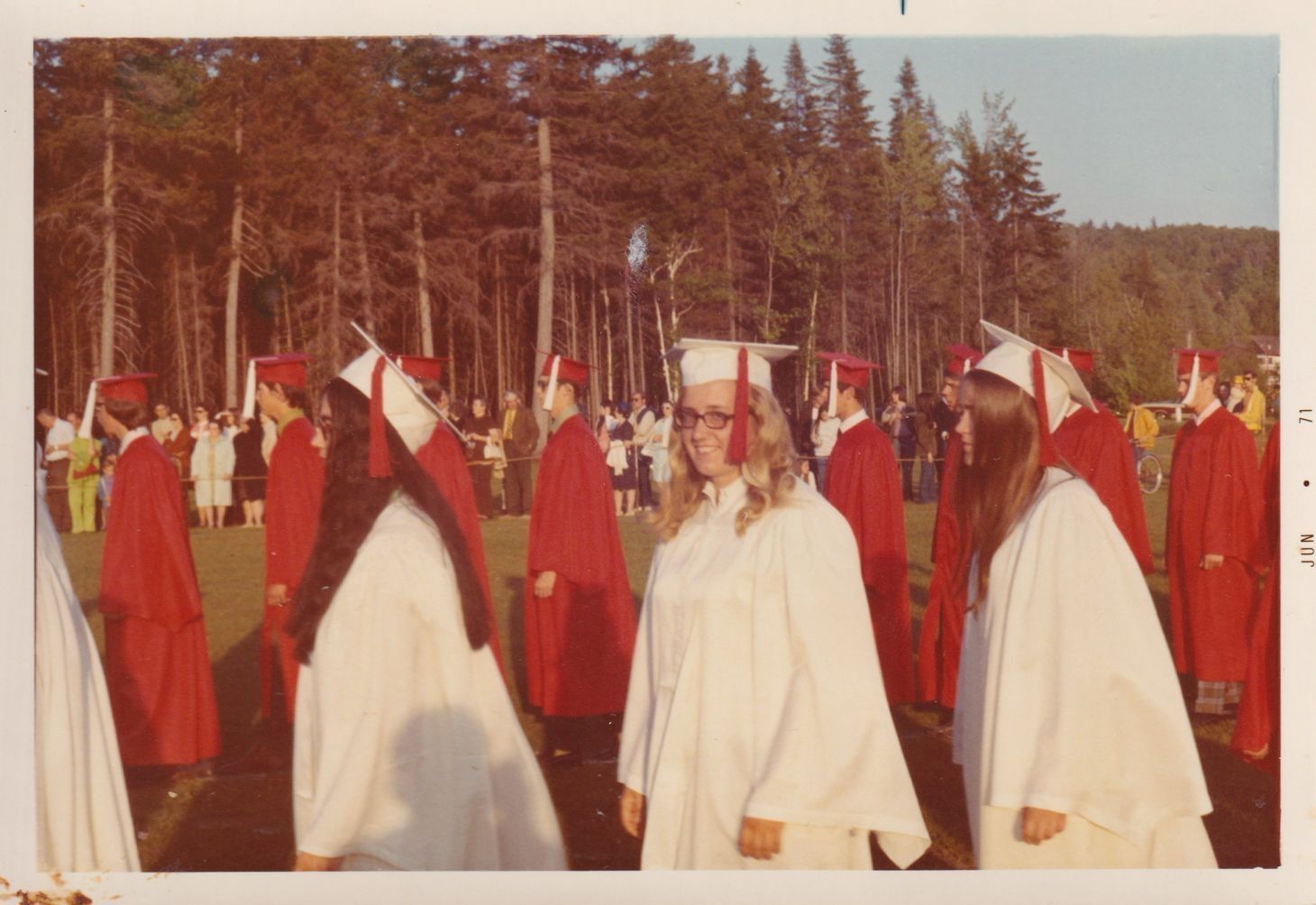 Black-and-white photograph of Carol Davis in a white cap and gown in a line with other young women in white caps and gowns. Carol is smiling at the camera. There is a line of young men in red caps and gowns walking to the side of them. "Jun 71" is printed on the right edge of the photograph.