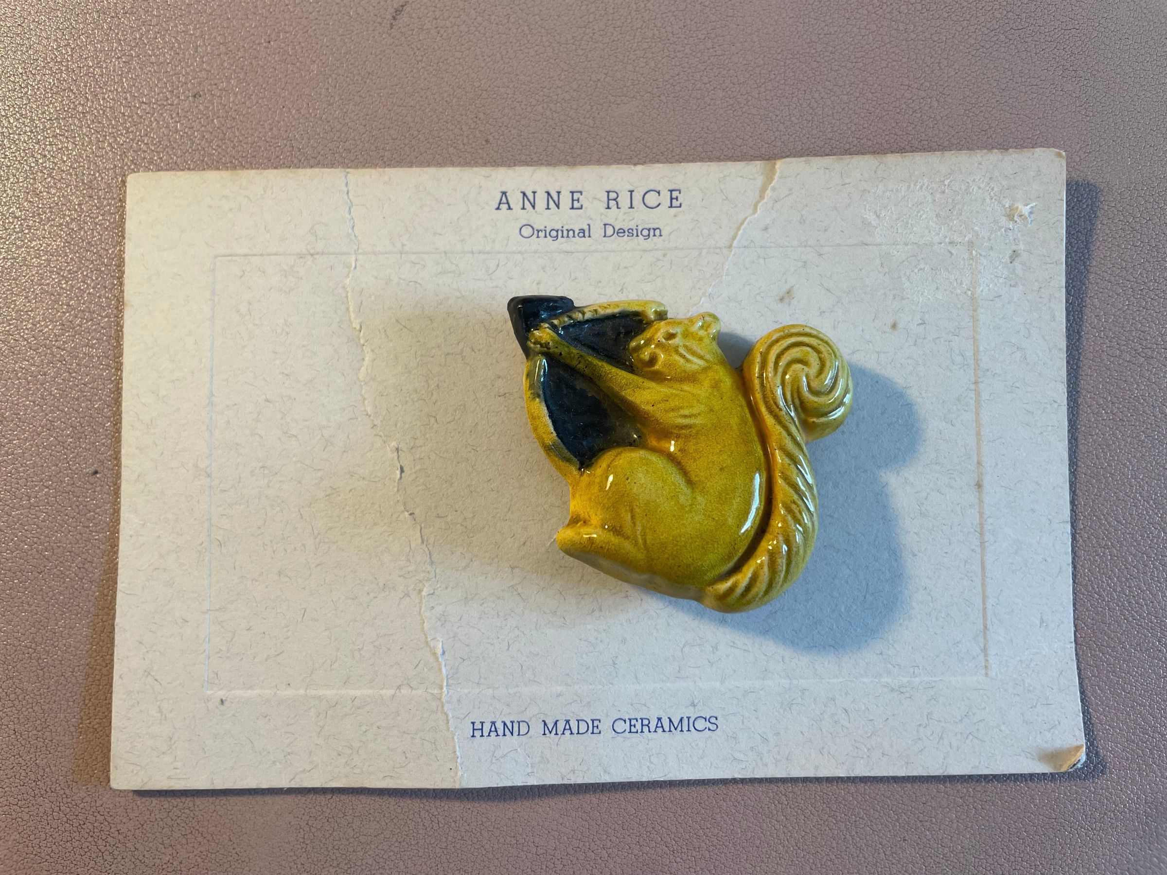 Ceramic pin with squirrel design, by Anne Rice. Squirrel is yellow, and is holding a green bow and arrow. Mounted on cardstock backing reading, "Anne Rice - Original Design - Hand Made Ceramics."