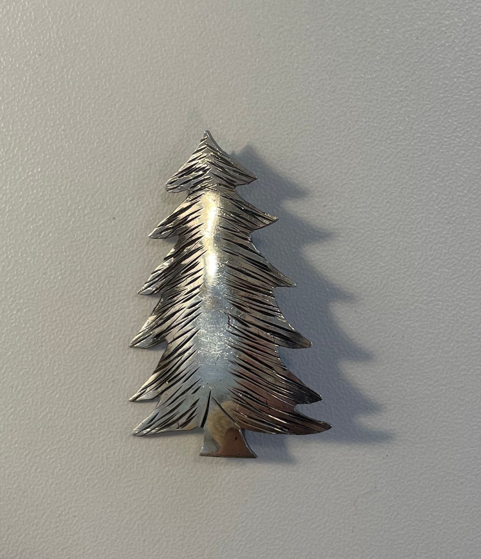 Silver evergreen tree pin with bar backing. Stamped, "Sterling. Handwrought by Temming," on reverse.
