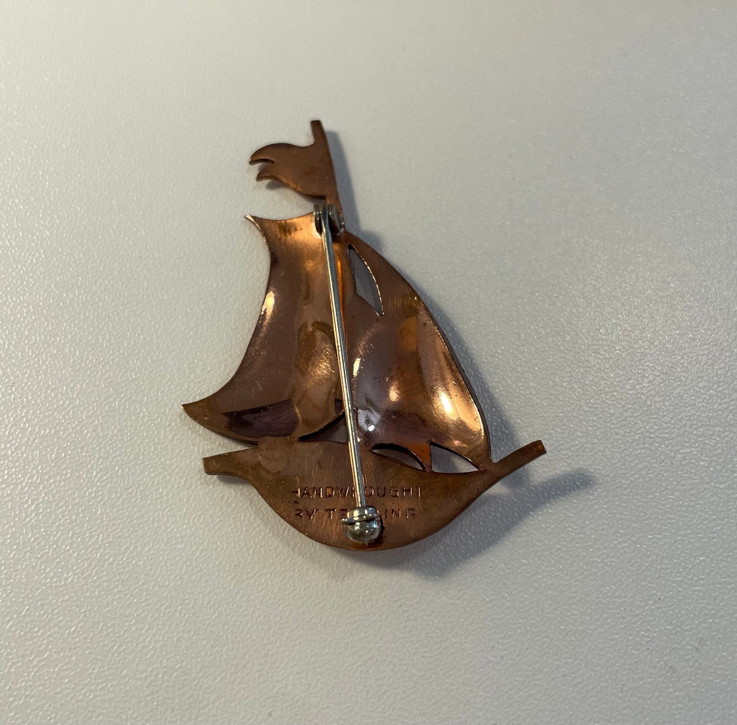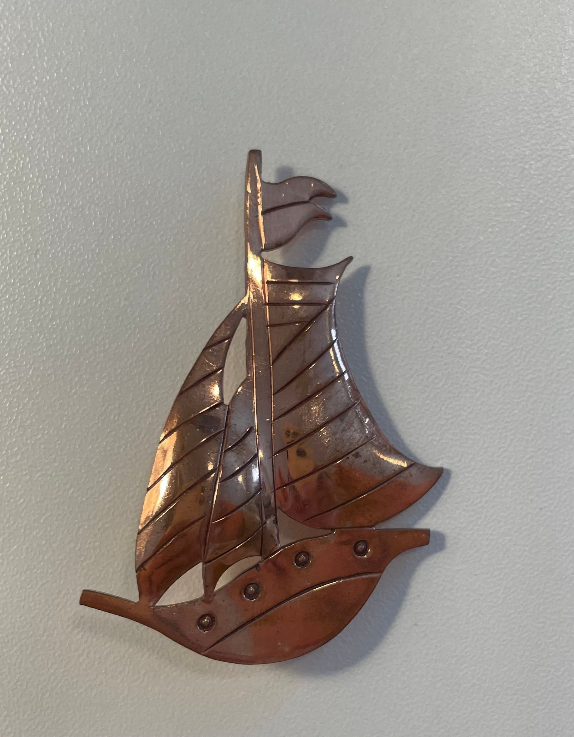 Copper sailboat pin with bar backing. Produced by Temming Art Studio. Marked "Handwrought by Temming" on reverse.