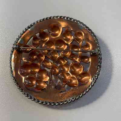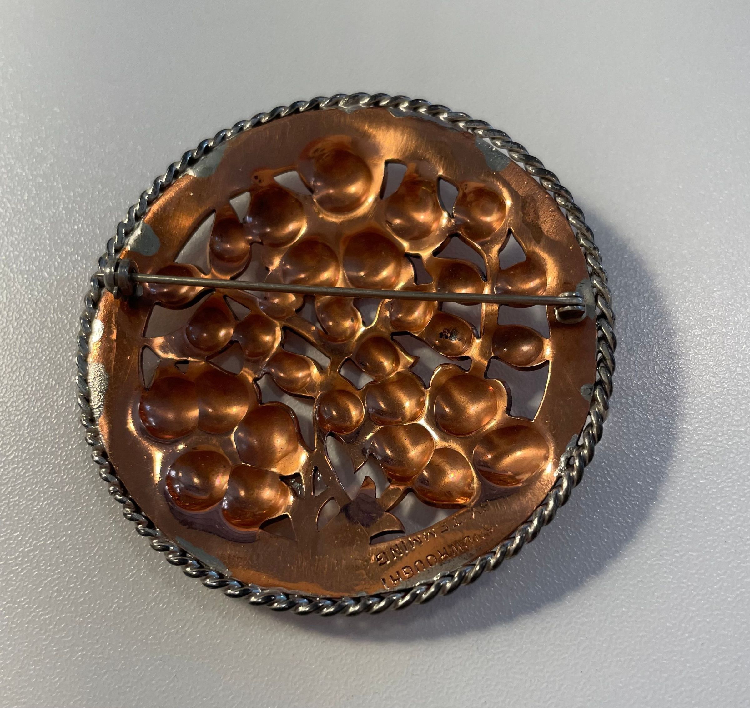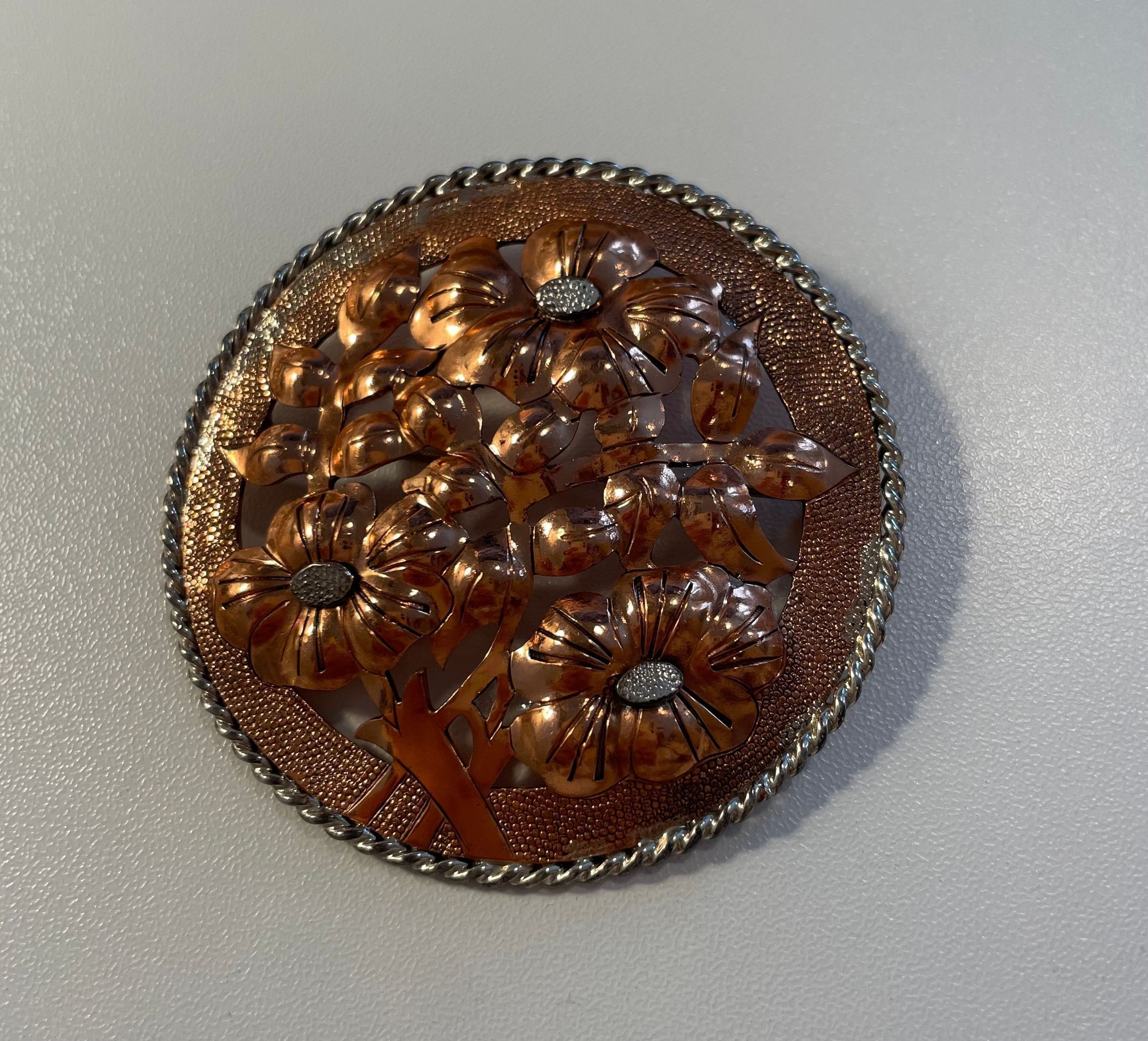 Silver and copper flower pin. Made up of copper flowers in a round medallion, rimmed with silver. The centers of the flowers are silver. Produced by Temming Art Studio. Marked "Handwrought by Temming" on reverse.