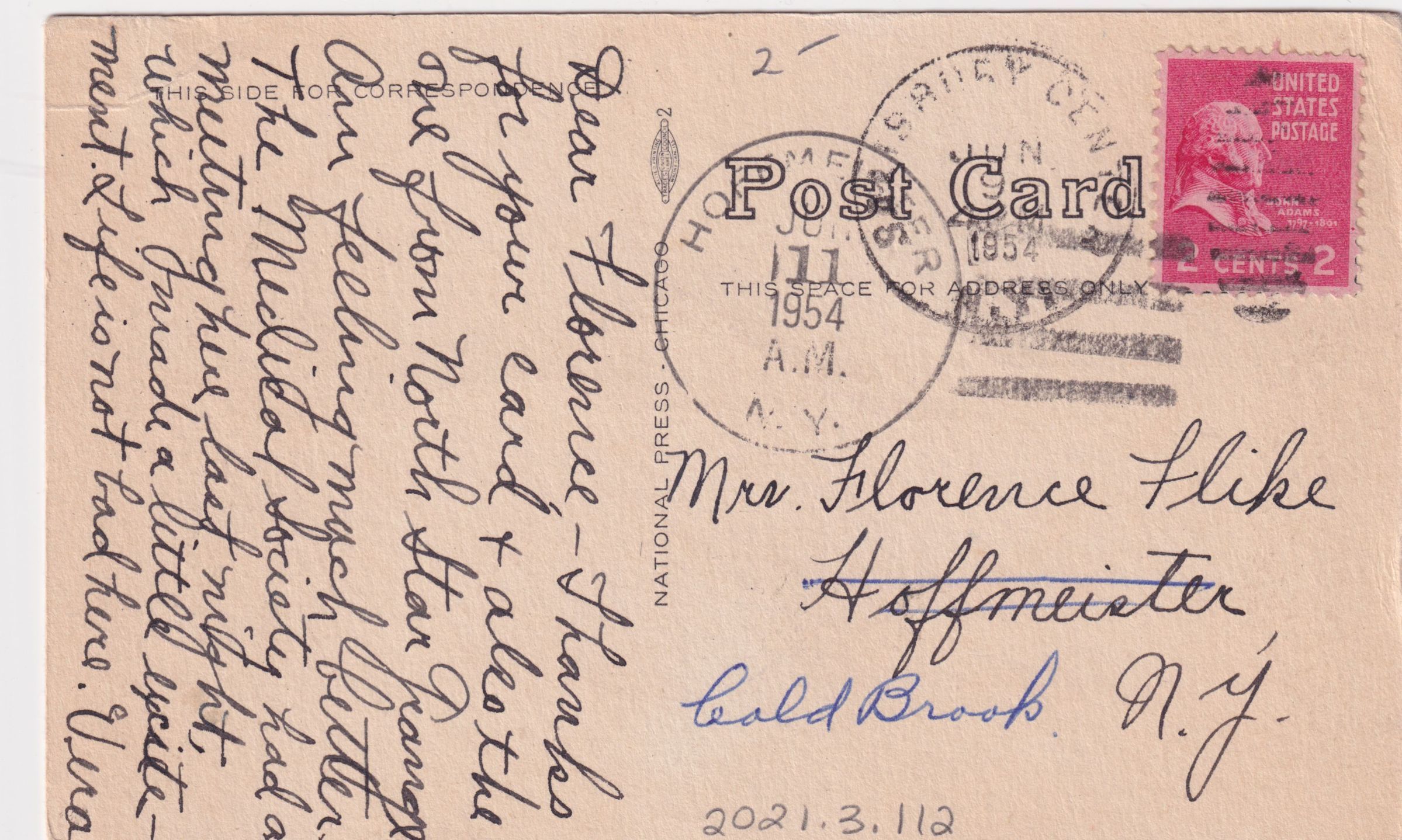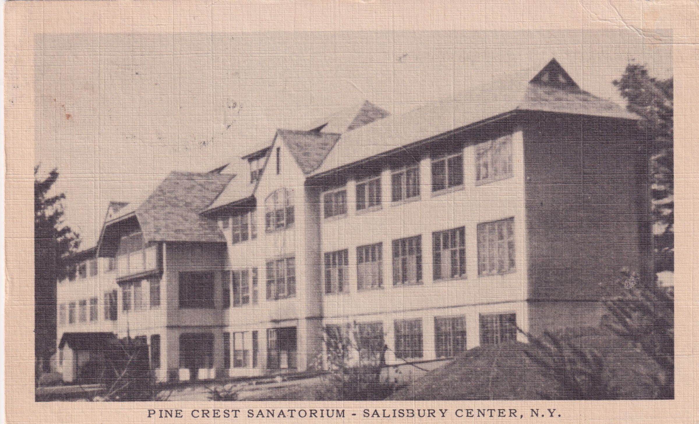Postcard showing a large institutional building. Printed caption on front reads, "Pine Crest Sanatorium, Salisbury Center, N.Y." Used, divided back, white border, postmarked Salisbury Center, NY, June 9, 1954. Printed by National Press, Chicago. Handwritten message on back reads, "Dear Florence, Thanks for your card & also the one from North Star Grange. Am feeling much better. The Medical Society had a meeting here last night which made a little excitement. Life is not bad here, Vera." Mailed to Mrs. Florence Flike, Hoffmeister [crossed out], Bald Brook, NY.Collection