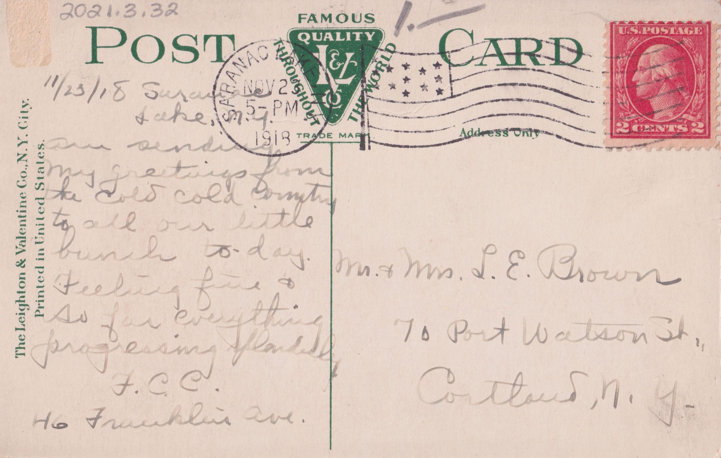 Color postcard showing the Post Office Building, 69 [74] Main Street. Used, divided back, postmarked November 23, 1918, Saranac Lake, NY. Printed by The Leighton & Valentine Co. NY. Caption printed on front reads, "Post Office Building, Saranac Lake, N.Y." Handwritten message on back reads, "11/23/18, Saranac Lake, N.Y. Am sending my greetings from the cold, cold country to all our little bunch today. Feeling fine and so far everything progressing splendidly. F. C. C. 46 Franklin Ave."Subject Place